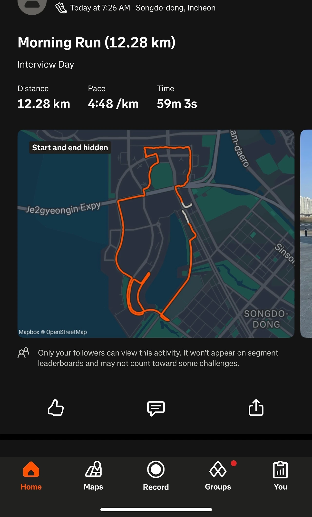 오후 5시쯤 숙소 체크인을 하고 근처 샐러드집에서 연어샐러드를 픽업해 왔다. 샤워를 하고 면접 실전연습을 간단히 한 후 일찍 잠자리에 들었다. 7-8시간의 충분한 수면 후 아침 러닝을 다녀왔다. 10 km 러닝을 계획했는데 길을 잃어 12 km를 뛰어버리는 변수가 있었지만… 심박수를 한 껏 올리고 땀을 쭉 빼니 긴장도 풀리고 기분이 매우 좋아졌다. 아침식사로도 좋아하는 콩나물 국밥을 먹었다. 이보다 더 개운한 아침이 있을까…