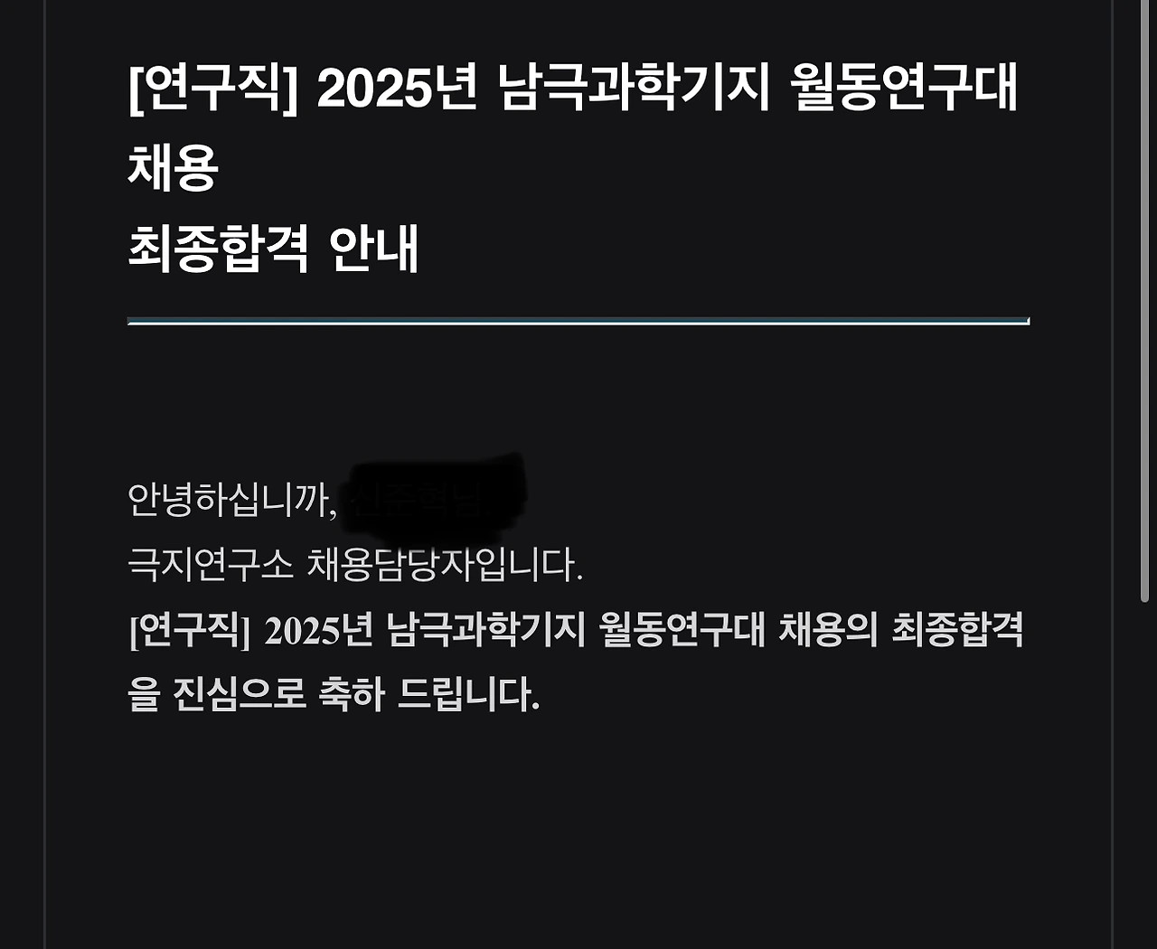 그리고 드디어 7월 23일, 극지연구소에서 남극 장보고 과학기지 월동연구대 최종합격 연락을 받았다. 채용공고에 따르면 6월 말에 최종합격 연락을 준다고 했지만 이번에는 어떤 이유로 늦어진 것 같다. 나도 늦어진 최종합격 소식에 걱정이 좀 됐는데, 문자를 받고 안심했다. 이제 남극행이 확정된 것이다. 축하 메시지와 함께 향후 (잠정) 일정을 보내주셨다. 직무교육, 소양교육 및 발대식, 극지적응훈련, 출국 예정일 등이다. 중간중간 개인짐 보내기와 월동대 모임 등의 준비과정이 있다. 절차가 많은 걸 보니 역시 사람이 극지로 가는 건 결코 쉽지 않은 것 같다.