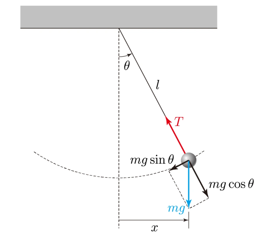 여기서 θ는 진자의 각도, θ¨는 시간의 두 번 미분 을 나타냅니다. 두 번 미분한 것이 원래의 것과 같은 형태여야 한다는 것인데, 그런 함수 중 대표주자는? 여러분이 잘 아시는 바로, sin 함수인거죠. sin 함수는 반복해서 한 주기를 지나면 같은 위치가 되잖아요? 보이는 현상과도 같네요. 이것을 풀면 주기는 아래와 같게 되는 것이죠.