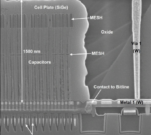위 사진은 인터넷에서 구한 DRMA의 구조 사진이다. (보안상 공개 자료만 사용한다) 높이는 1500nm로 되어 있다. 구멍의 크기는? 대략 50nm 이하로 보인다. 30 대 1보다 비율이 크게 뚫어야 한다는 것. '30 대 1 정도야'라고 할지도 모르겠으나, 구멍이 50nm 이하인데도 쉬울까? 1억분의 5 미터 크기의 구멍을 뚫는 것이다. (빛의 짧은 파장보다도 10배 정도 작다) 게다가 이 구멍들을 30cm의 실리콘 원형의 웨이퍼에 모두 균일하게 뚫어야 하는데 말이다.