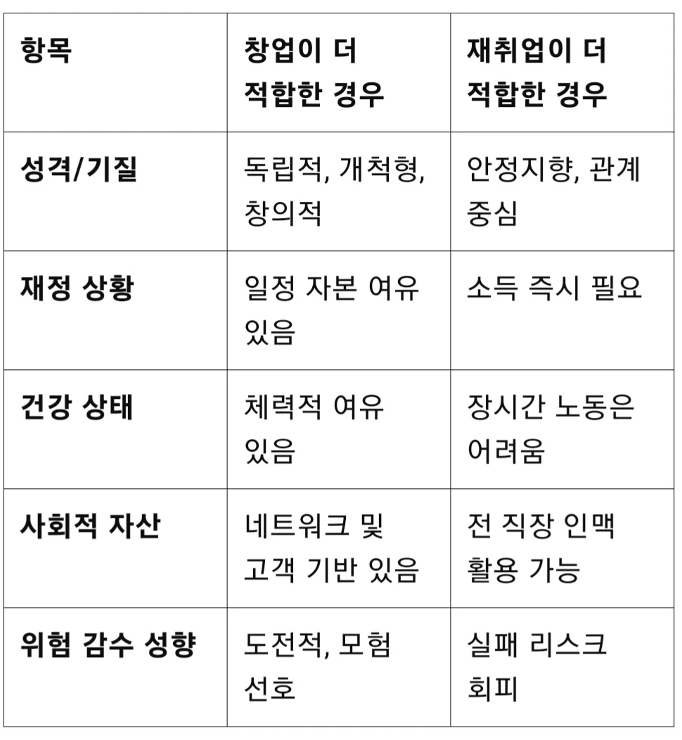 * 창업은 자신의 전문성, 네트워크, 시장 이해도가 충분할 때 안정적으로 추진 가능함.
