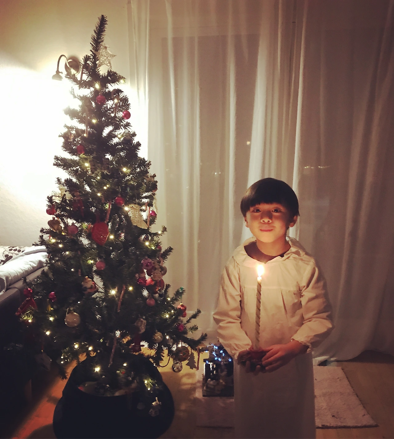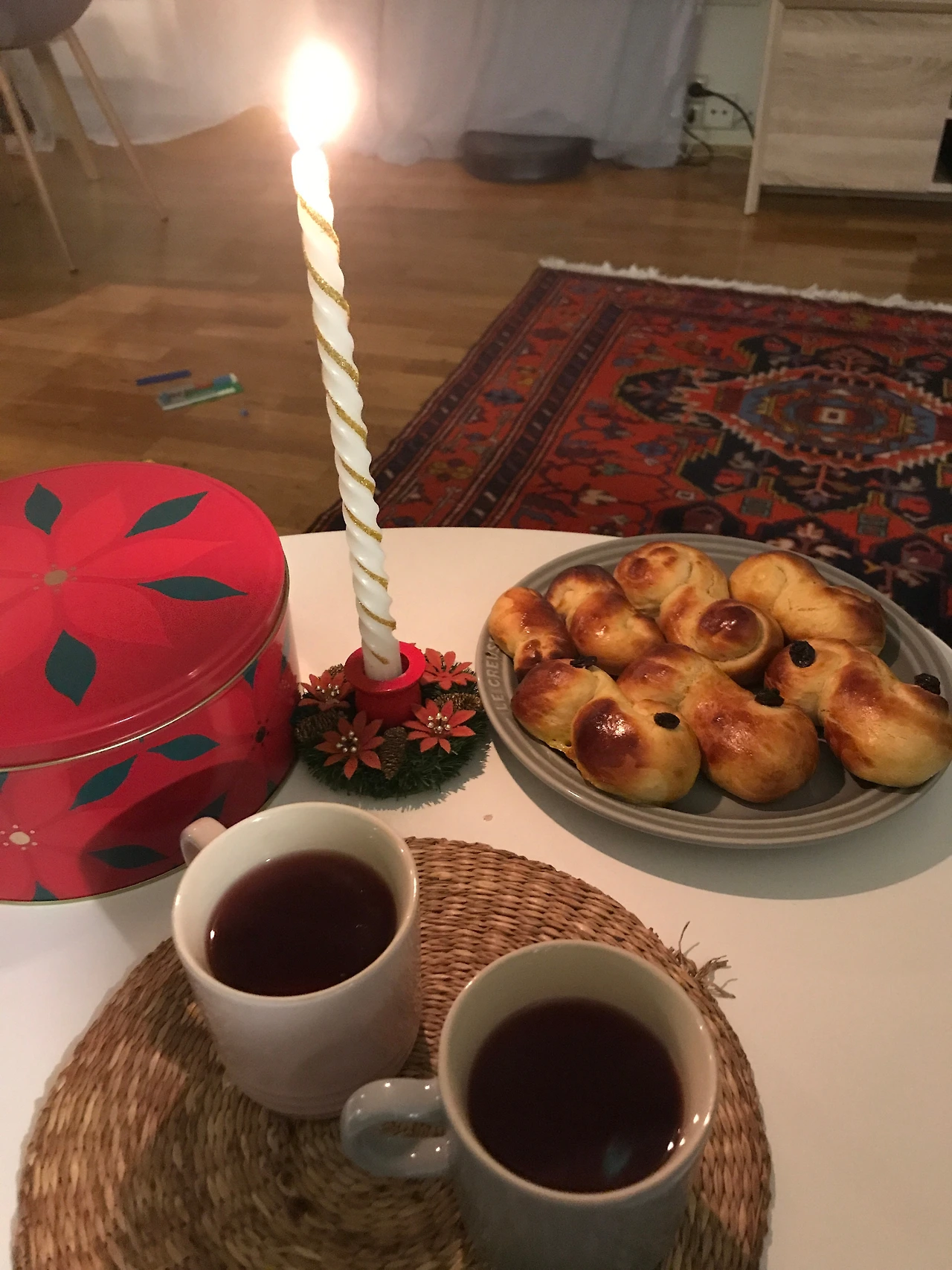 12월 13일이 되자 루시아 성인을 기념하는 산타루시아 날이 왔다. 이날은 아이들이 하얀 드레스를 입고 촛불이 달린 관을 쓰거나 촛불을 들고 다니는 행사를 한다. 또한 마을 곳곳이 불로 밝혀지고 노래를 부르며 샤프란빵을 만들고 진저브레드 쿠키를 먹기도 한다. 루시아 날은 어두움에 빛을 가져온다는 의미를 기념한다. 하교한 아이들과 샤프란 넣어 만든 반죽을 반죽기에 돌린 후 고양이꼬리 모양으로 빚어서 건포도 두알을 올려 오븐에 구웠다. 성탄절 차와(계피향) 함께한 그 맛이 일품이었다.