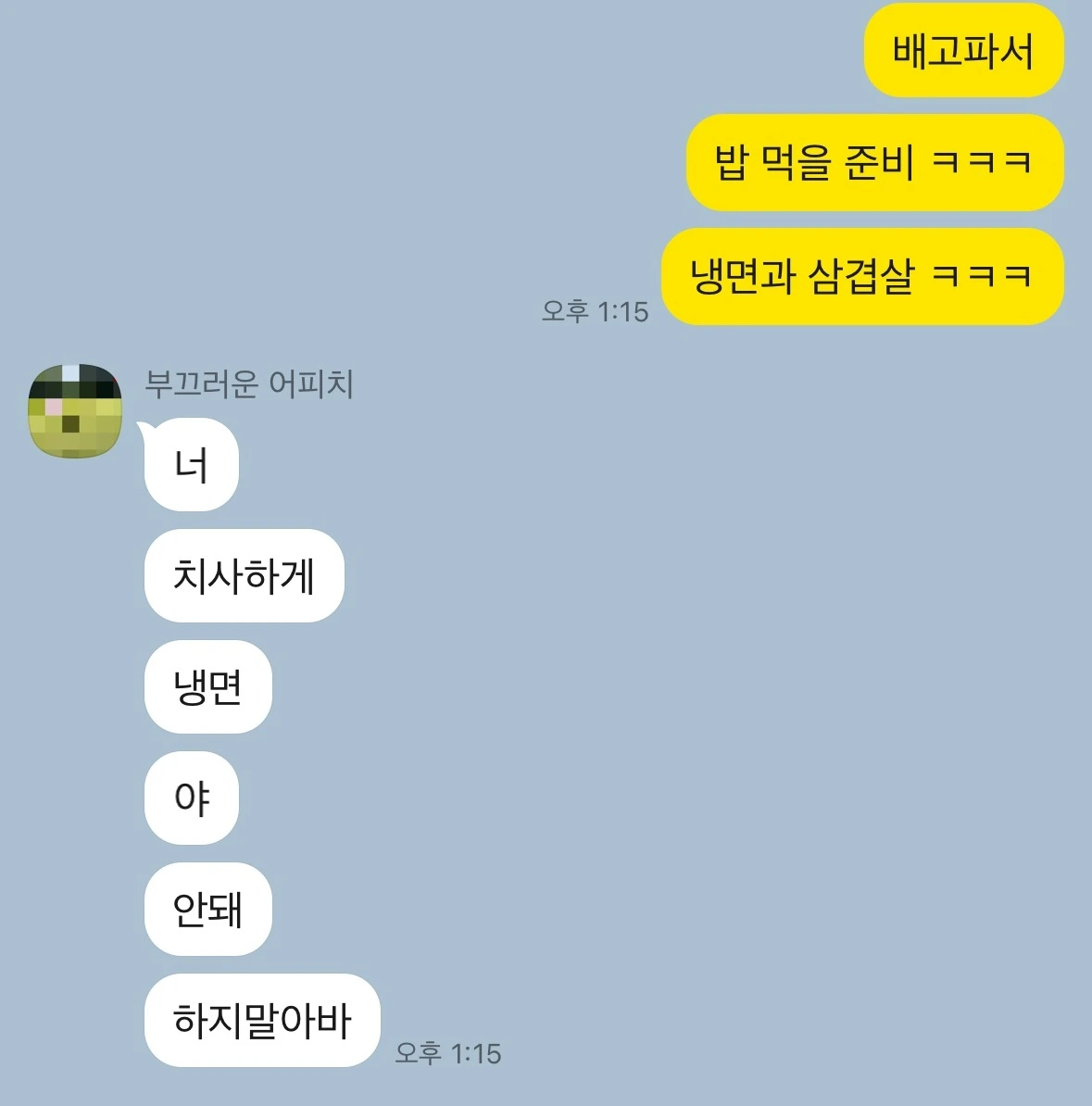 바로 카톡으로 고맙단 말과 함께 놀람을 표현했다. 놀람은 여기서 끝이 아니었다. 뭔가 더 온다는 게 아닌가. 우린 이미 냉면에 삼겹살을 먹을 준비를 끝냈는데... 그렇게 오늘 점심은 대환장 폭식 파티가 시작되었다. 뭐가 올지 모르니 조금만 먹자고 하고 이야기를 나누며 음식을 기다렸다. 그런데... 냉면과 삼겹살이 너무 맛있어서 젓가락이 멈추지 않는 건 어쩔 수 없었다. 그렇게 빈 그릇이 생기고 배달기사분이 도착했다. 하하하. 피자 두 판이 도착했다. 상을 치우지 않고 옆에 상에 다시 상을 차렸다. "배고프시죠? 점심 식사해요 우리 하하하." 다들 나의 상황극에 맞장구를 치며 오늘의 두 번째 아니지 첫 번째 점심 식사를 시작했다.