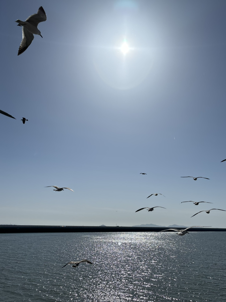 책을 읽고 풍경도 보고 그렇게 시간을 보낸 1시간이 사라졌다. 그냥 돌아가기 아쉬워 바다가 좀 더 가까워 보이는 장소에 들렀다 가기로 했다. 수많은 갈매기가 우리를 반겨주는 것 같았다. 갈매기 무리 속 비둘기가 숨어 있었다. 깨알같이 그걸 찾아낸 지후, 깔깔 웃으며 마치 미운오리새끼처럼 표현하는 게 지후다움이 느껴졌다.