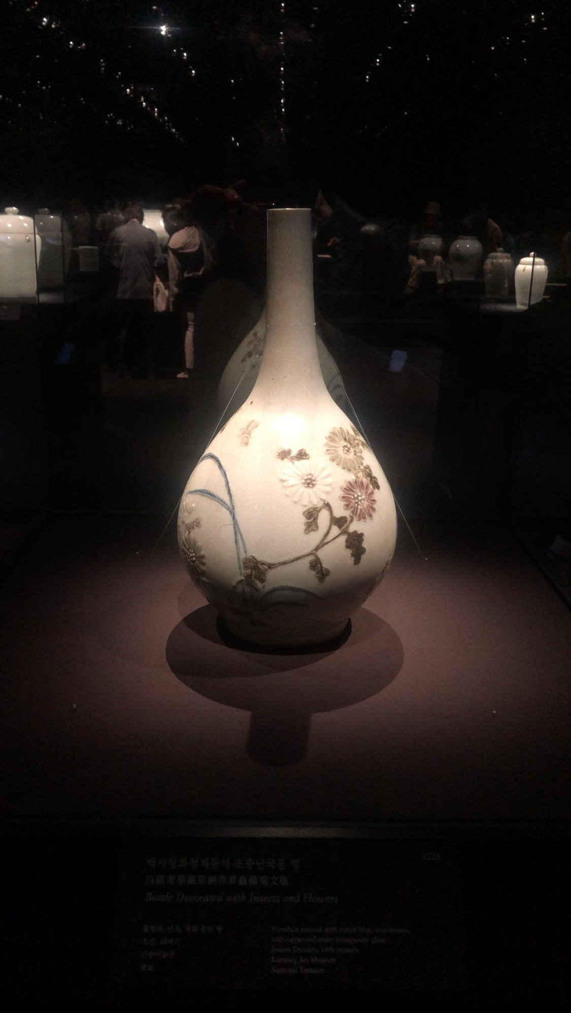 조선 초기부터 말기까지의 작품들 중 일반인들이 보기 힘든 작품이 있다. 청화백자양각진사철채난국초충문병 청화 백자 중 가장 난해한 기법으로 제조된 국보다. 간송 미술관의 소장 작품인데, 일반에 공개가 잘 되지 않는 작품 중 하나다. 작년 간송 수장고에서 보고 이번이 두 번째이다.
