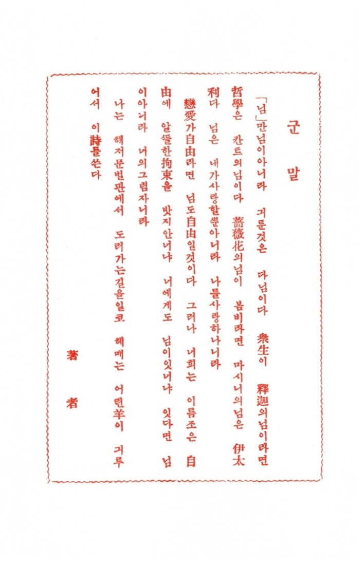 「님」만 님이 아니라, 기룬 것은 다 님이다. 중생이 석가의 님이라면, 철학은 칸트의 님이다. 薔薇花의 님이 봄비라면 마시니의 님은 이태 리다. 님은 내가 사랑할 뿐 아니라 나를 사랑하나니라.