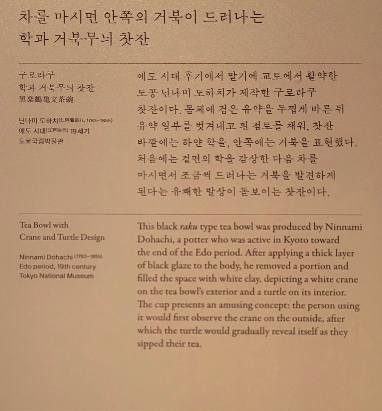 고요속의 재미와 차 한잔의 여유를 즐기다. 에도 시대 후기에서 말기에 교토에서 활약한 도공 닌나미 도하치가 제작한 구로라쿠 찻잔이다.