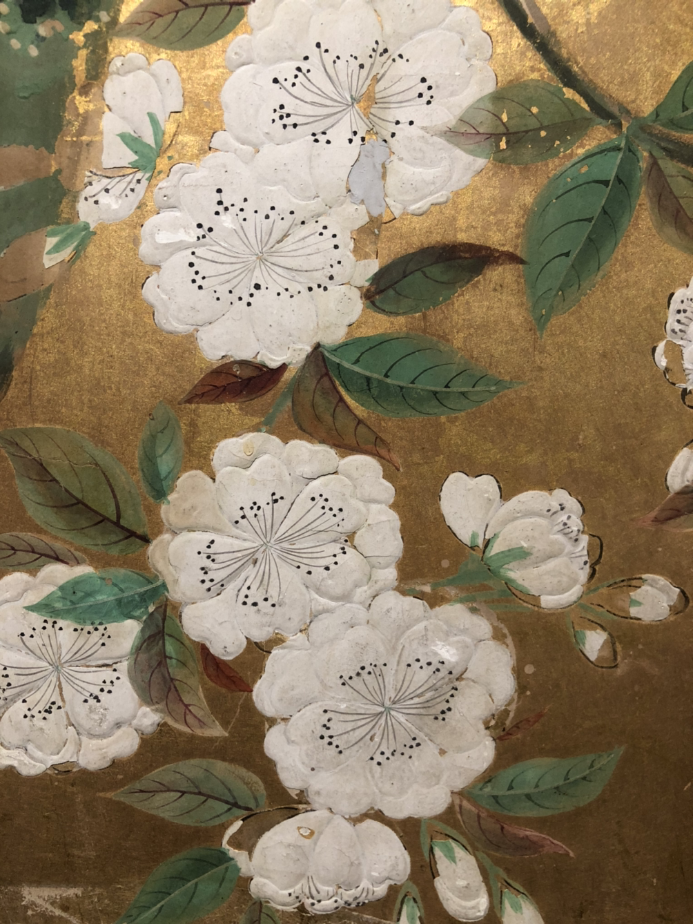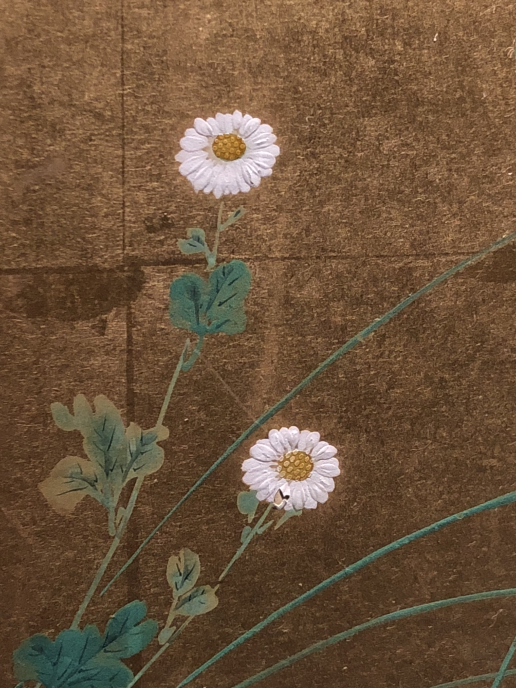 가을의 꽃과 풀을 금박 바탕에 섬세하게 묘사한 그림이다. 병풍에는 쭉 뻗은 가지 끝에 노란 꽃이 핀 마타리, 긴 가지 끝에 자줏빛이 섞인 자그마한 흰색 꽃이 촘촘히 모인 등골나물, 그 아래로 푸른 꽃을 활짝 피운 도라지 등이 바람에 흔들려 자연스럽게 나부끼는 모습을 그렸다. 마타리, 등골나물, 도라지는 8세기 무렵의 시가집 『만요슈』에 실린 시에서 유래한 ‘가을의 일곱 풀’에 속한다. 가을에 잠시 피었다 지는 풀꽃은 지나가는 것에 대한 아쉬움과 애틋함을 담고 있다. 가을풀은 일본에서 그림 소재로 널리 사랑받았다.