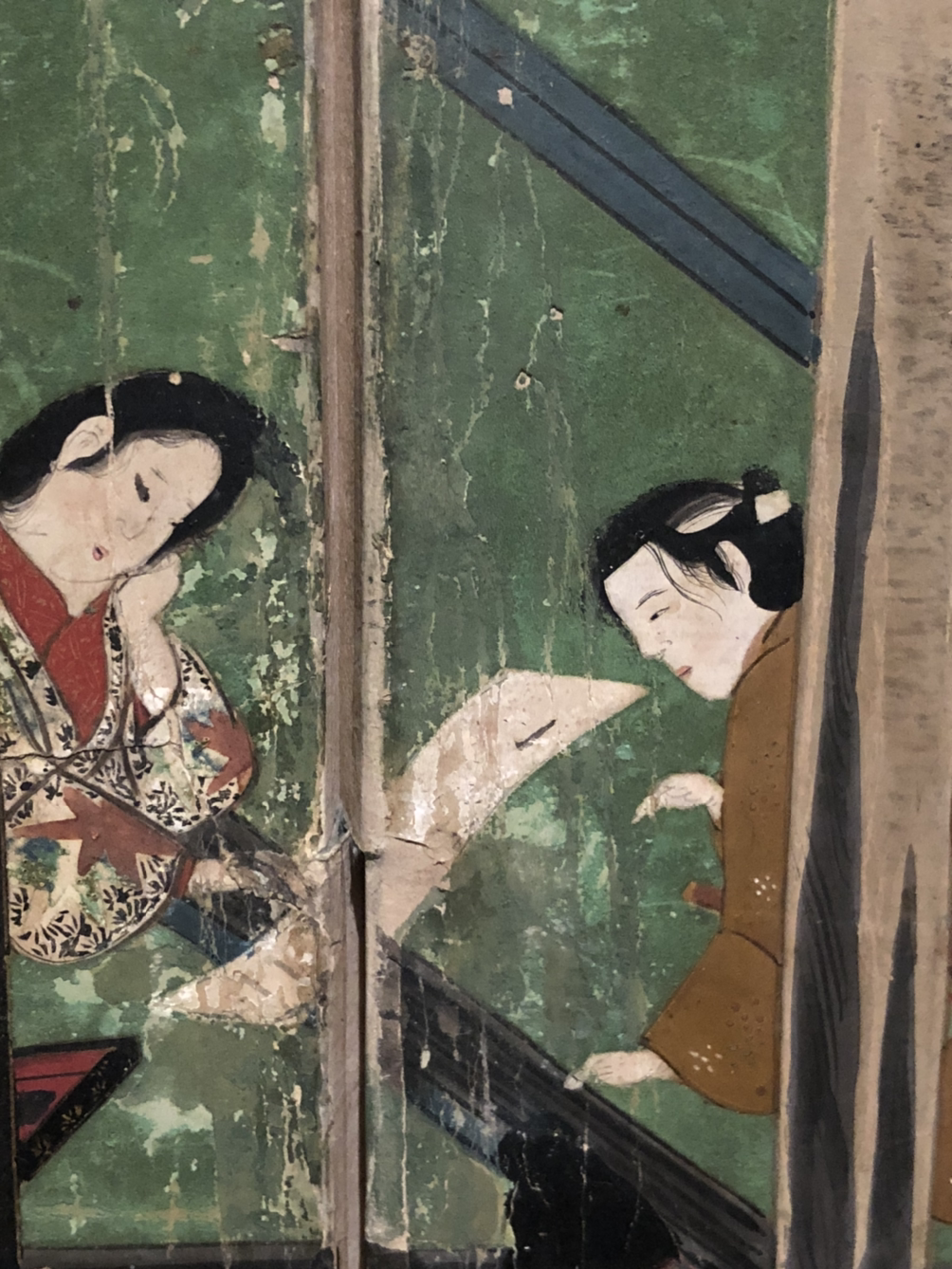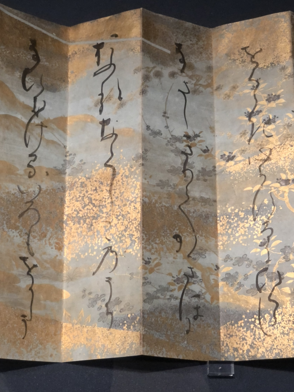 호분을 바른 흰색과 옅은 남색 종이에 사계절의 변화가 느껴지는 들판과 산골 마을의 풍경을 금은 가루로 그렸다. 글씨와 종이 장식이 어우러져 산장을 배경으로 펼쳐지는 「유기리(夕舞, 저녁 안개)」의 정경이 한층 돋보이며, 『겐지모노가타리』의 바탕이 되는 궁정 문화의 아름다움을 보여준다.