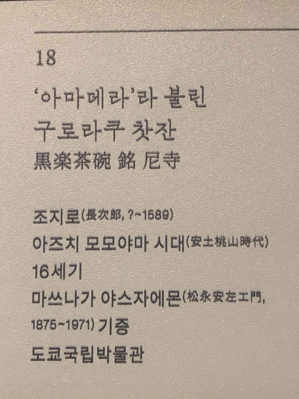 메이지시대부터 쇼와에 걸쳐 일본의 전력과 보급 및 진흥에 힘쓴 마쓰나가 야스자에몬. 그는 ‘일본의 전기왕’, ‘전력의 귀신’ 이라고 불리운다.그가 수집한 일본의 구로라쿠 다완이다.