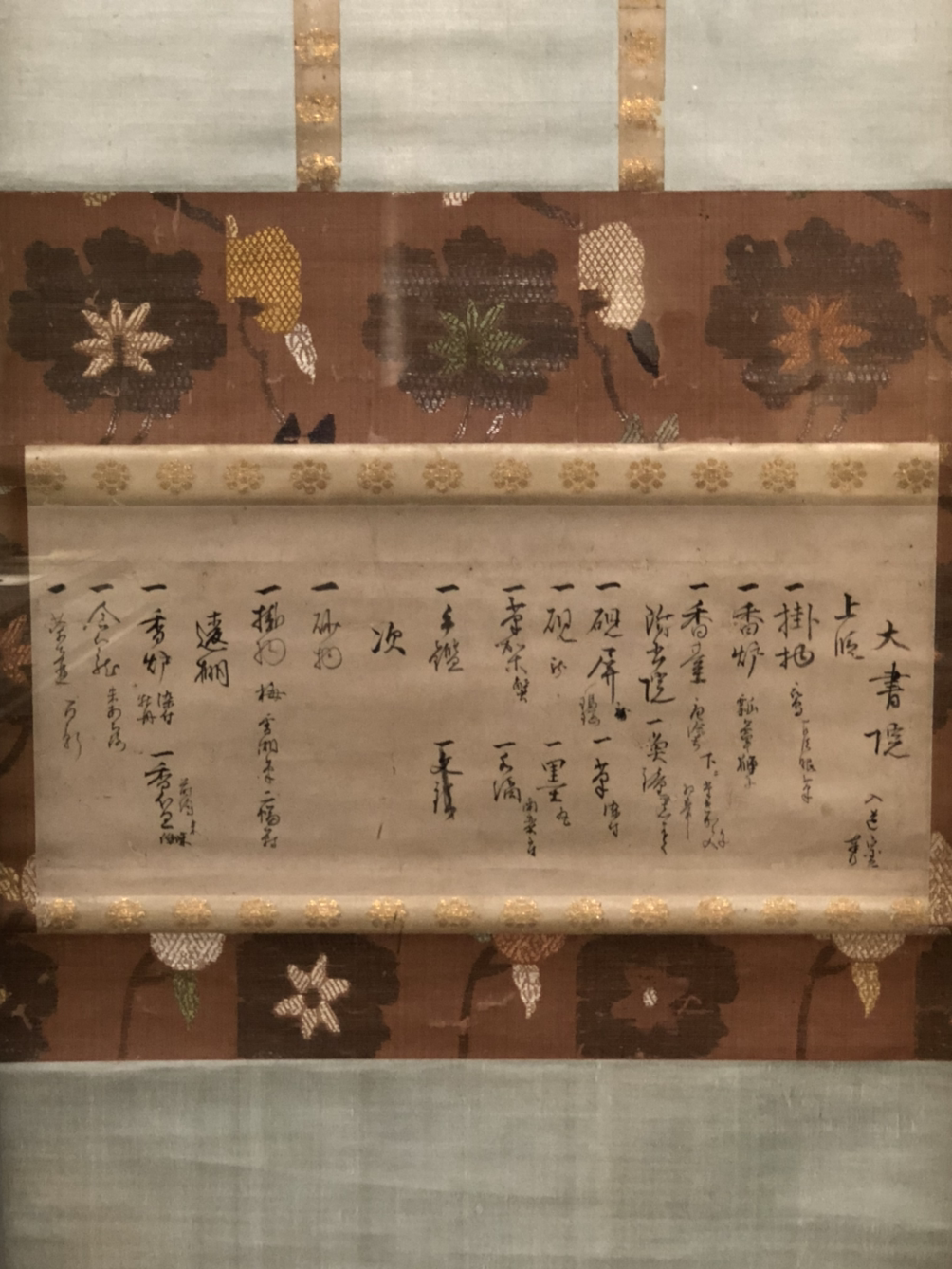 무장이자 다도 명인으로 활약한 호소카와 산사이가 차 모임을 연 다음 그 공간의 모습을 기록한 것이다. 손님을 맞이하는 넓은 방을 장식한 족자와 향로, 향대와 같은 물품을 간단히 나열했다. 이방에는 바닥을 한 단 높여 격식을 갖춘 공간인 조단노, 창문턱 형태로 만든 선반인 쓰케쇼인, 조단노마의 옆방인 쓰기노마, 장식용 선반인 지가이다나가 있어 물품을 위치별로 기록한 것을 알 수 있다. 센노 리큐의 다도를 계승하여 검소함을 미덕으로 삼았던 호소카와 산사이의 취향이 고스란히 느껴진다.