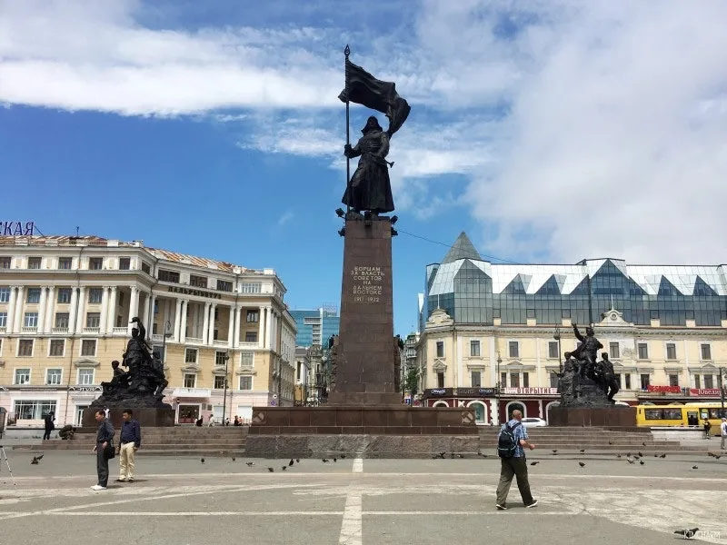 블라디보스톡 항구 근처에 딱 보이는 광장 하나가 있습니다. 혁명광장이라고 불리는데 탁 트여있고 동상 하나가 있었습니다. 사람은 많지 않았던 것 같습니다. 근처에 해군기지가 있어 해군복장 러시아인이 많았던 거 같습니다.