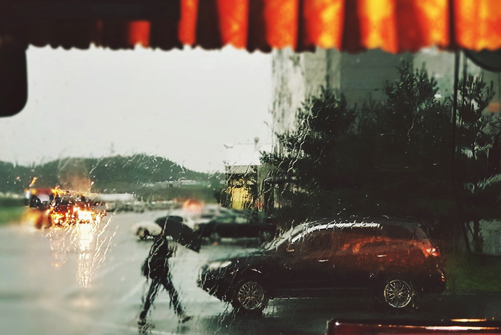 비 오는 창밖 풍경을 바라보는 무심한 시선.