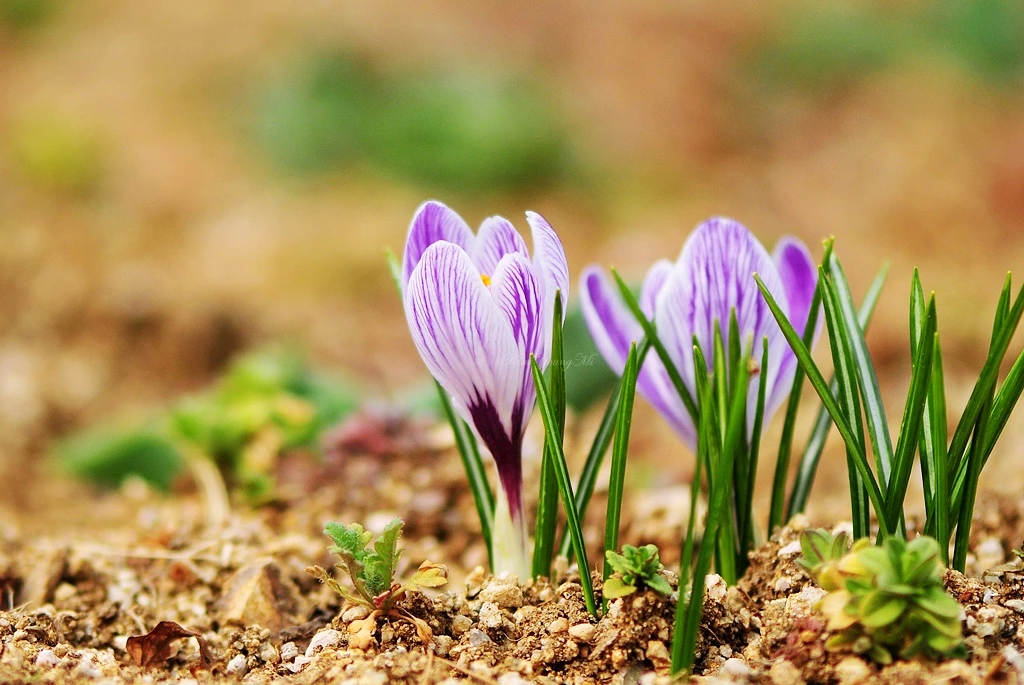크로커스. 봄에 피는 종을 크로커스라고 부르고 가을에 피는 꽃을 샤프란이라고 구분한다. 명확한 차이점은 샤프란은 크로커스에는 없는 길고 붉은 암술이 있다는 것이다.