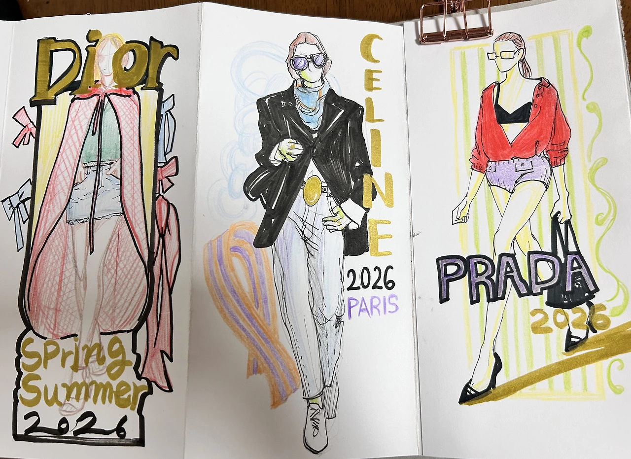 명품 패션쇼가 궁금해져서 쇼 중에 가장 기억에 남는 모델의 옷을 한 컷씩 노트에 그려보았다.