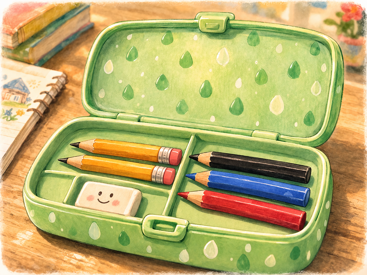 연두빛 물방울무늬 필통 안에는 연필 두 자루와 지우개 하나, 그리고 검정, 파랑과 빨강 색연필이 가지런히 놓였다.