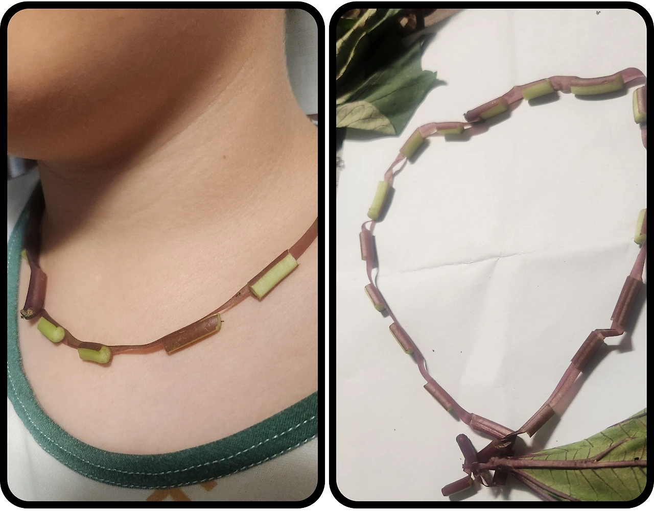 같이 앉아 도란도란 고구마순 껍질을 벗기다 보니 불현듯 나의 어린 시절에 엄마가 만들어 주신 고구마줄기 목걸이가 생각났다.