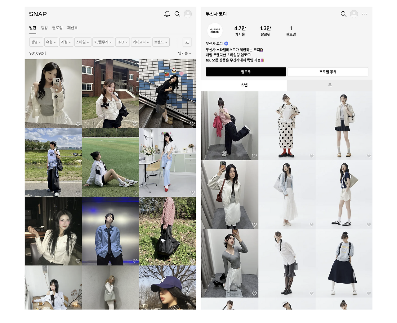 옷을 잘 입고는 싶은데 솔직히 브랜드는 잘 모르는 나에게 무신사는 꽤 익숙한 플랫폼이다. 쇼핑을 하려다 무심코 들어가면 그날의 랭킹이나 인기 브랜드를 훑어보게 되고, 무신사 스냅에서 스타일링 팁을 얻기도 하고. 그러다 보니 어느 순간 옷을 살 땐 자연스럽게 무신사를 먼저 검색하게 된다. 꼭 사지 않더라도 구경하듯 콘텐츠를 훑고 새로운 브랜드를 발견하고 스타일을 관찰한다. 무신사는 쇼핑이라는 행위 이상으로 ‘패션을 보는 습관’을 만들고 있었다.