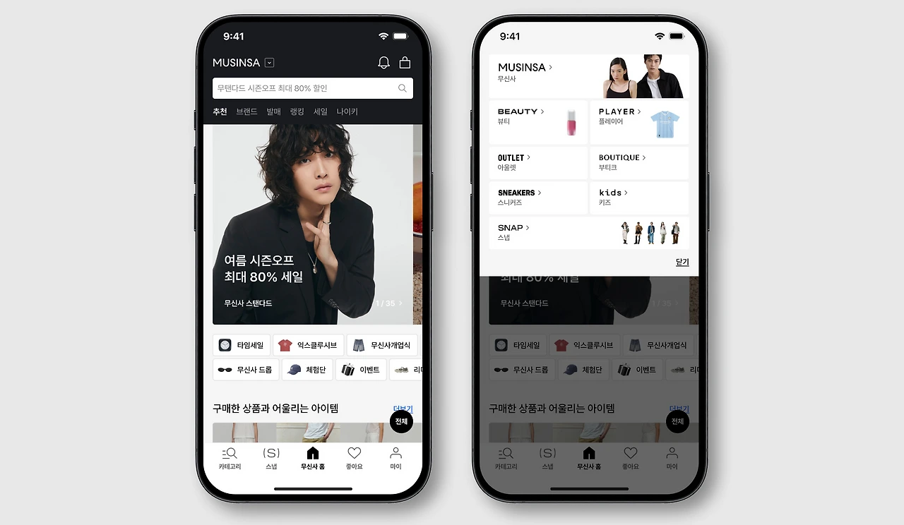 이처럼 커뮤니티 성향이 강한 무신사는 유저의 체류 시간과 재방문율이 높은 구조를 지니고 있다. 단순한 쇼핑몰을 넘어서, 브랜드와 사용자가 함께 콘텐츠를 소비하고 반응하는 미디어형 커머스 플랫폼으로 자리 잡아왔기 때문이다. 대표적인 전략이었던 ‘스냅’은 길거리 패션을 담아내던 ‘스트릿 스냅’에서 출발해, 지금은 누구나 자신의 스타일을 공유하고 제품 링크를 연결할 수 있는 참여형 콘텐츠로 진화했다. 커뮤니티의 감성을 유지하면서도 브랜드와의 이색 콜라보, PB 브랜드 운영, 뷰티·골프·키즈 등 전문관 확장 전략을 통해 카테고리를 넓히고 있다. 이처럼 단순히 제품을 파는 데 그치지 않고, 스타일과 라이프스타일 전반에서의 경험을 기획하는 태도가 오늘날 무신사를 계속 주목하게 만드는 이유다.