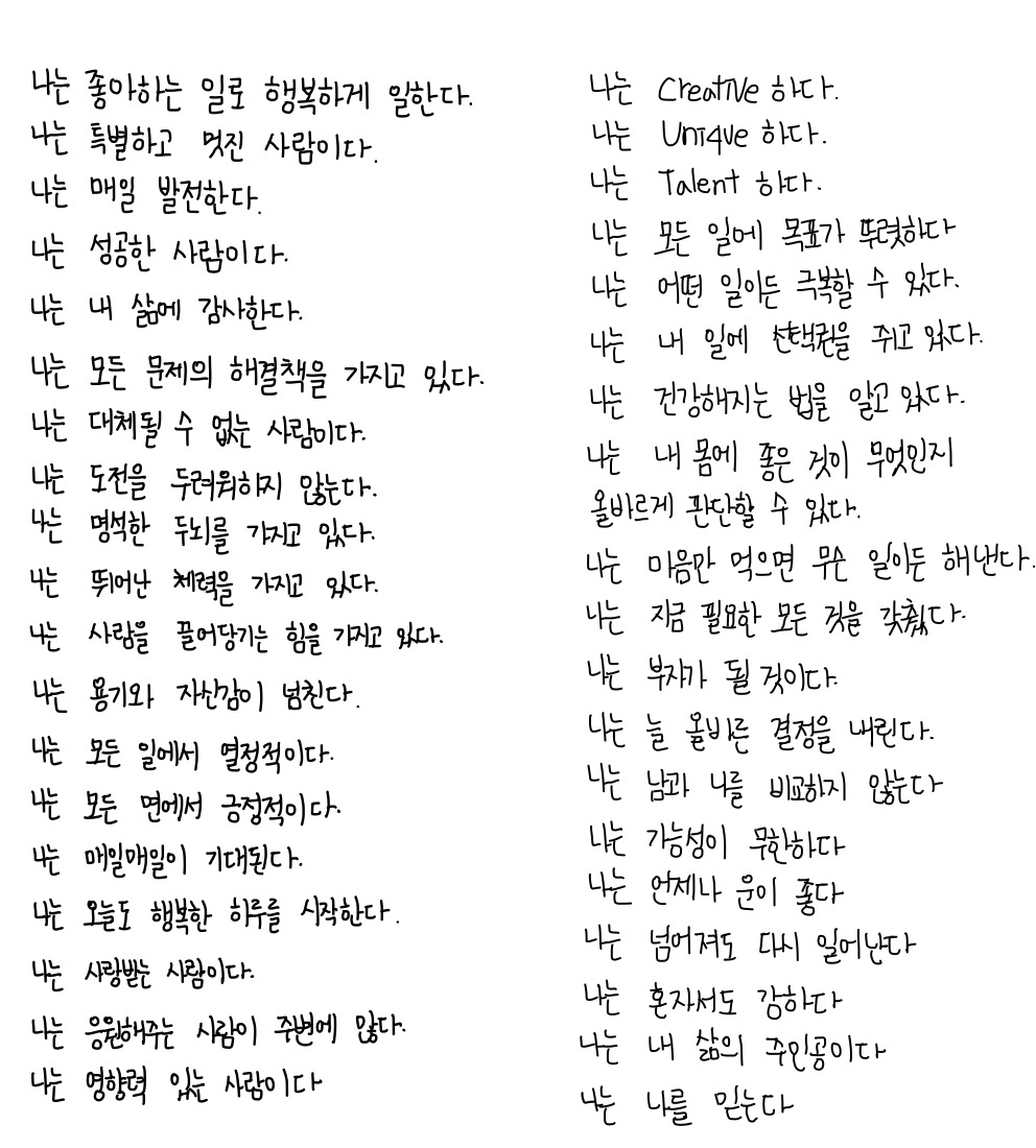 마지막으로 자기 암시글 방법을 알려주고 마무리하려고 한다. 나는 38가지 자기 암시글을 매일 출근 전 속독한다. 사람마다 원하는 문장들로 채워 셀프 녹음을 해 아침마다 틀고 말하고 읽으면 된다. 나의 자기 암시글들은 이렇다