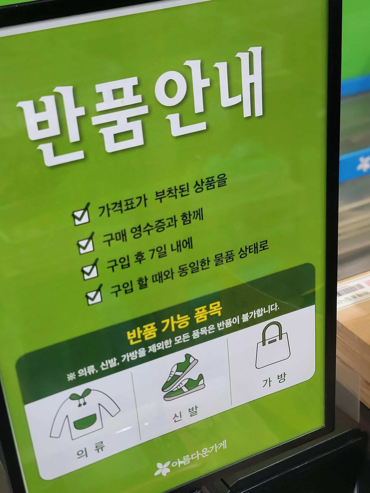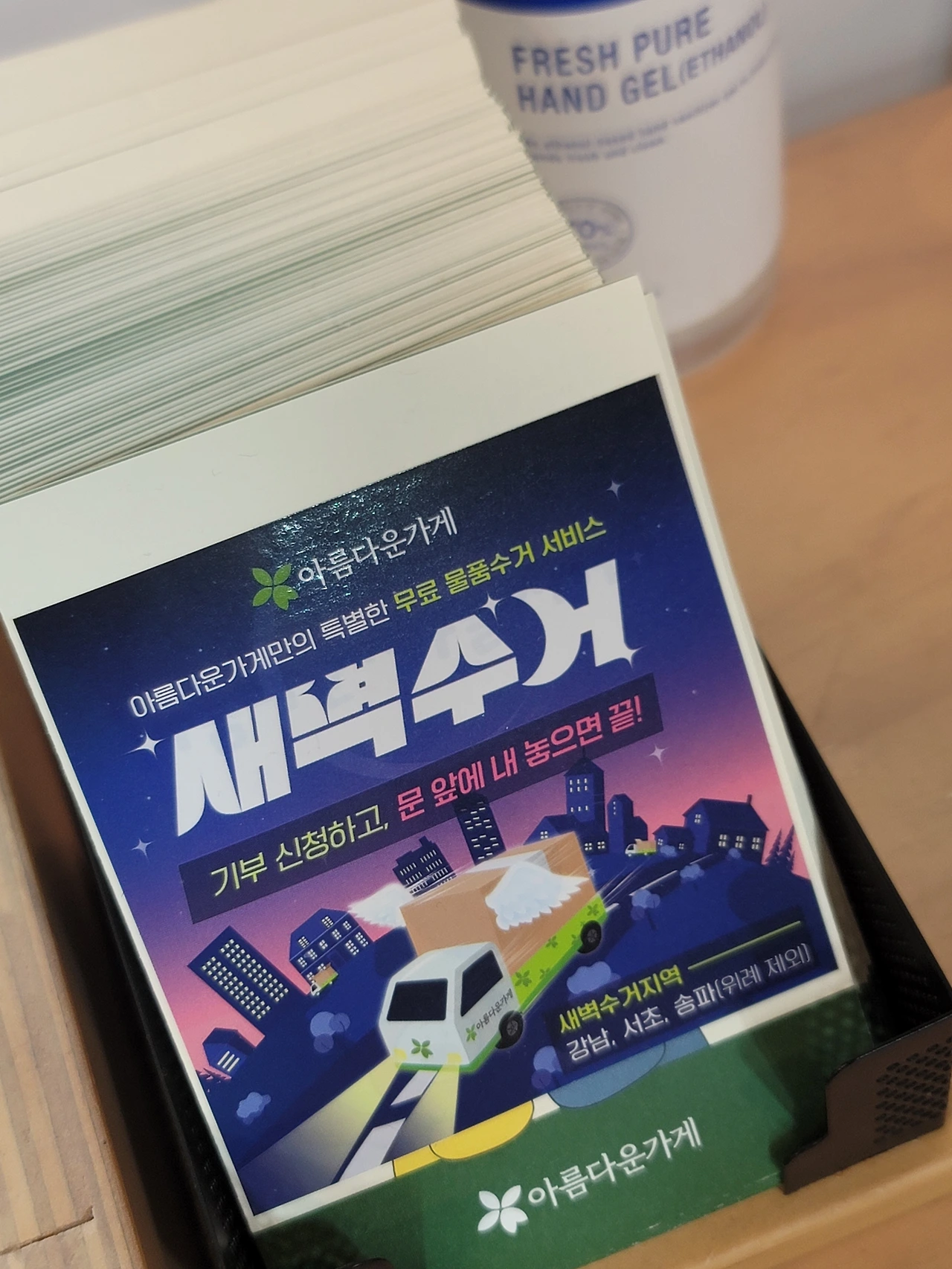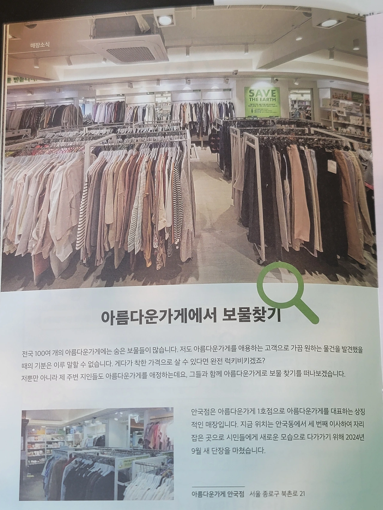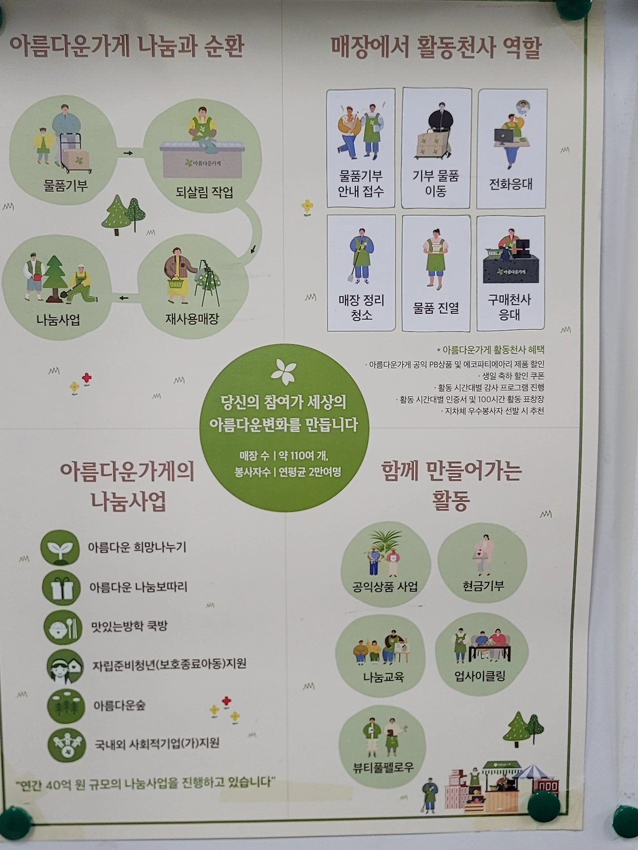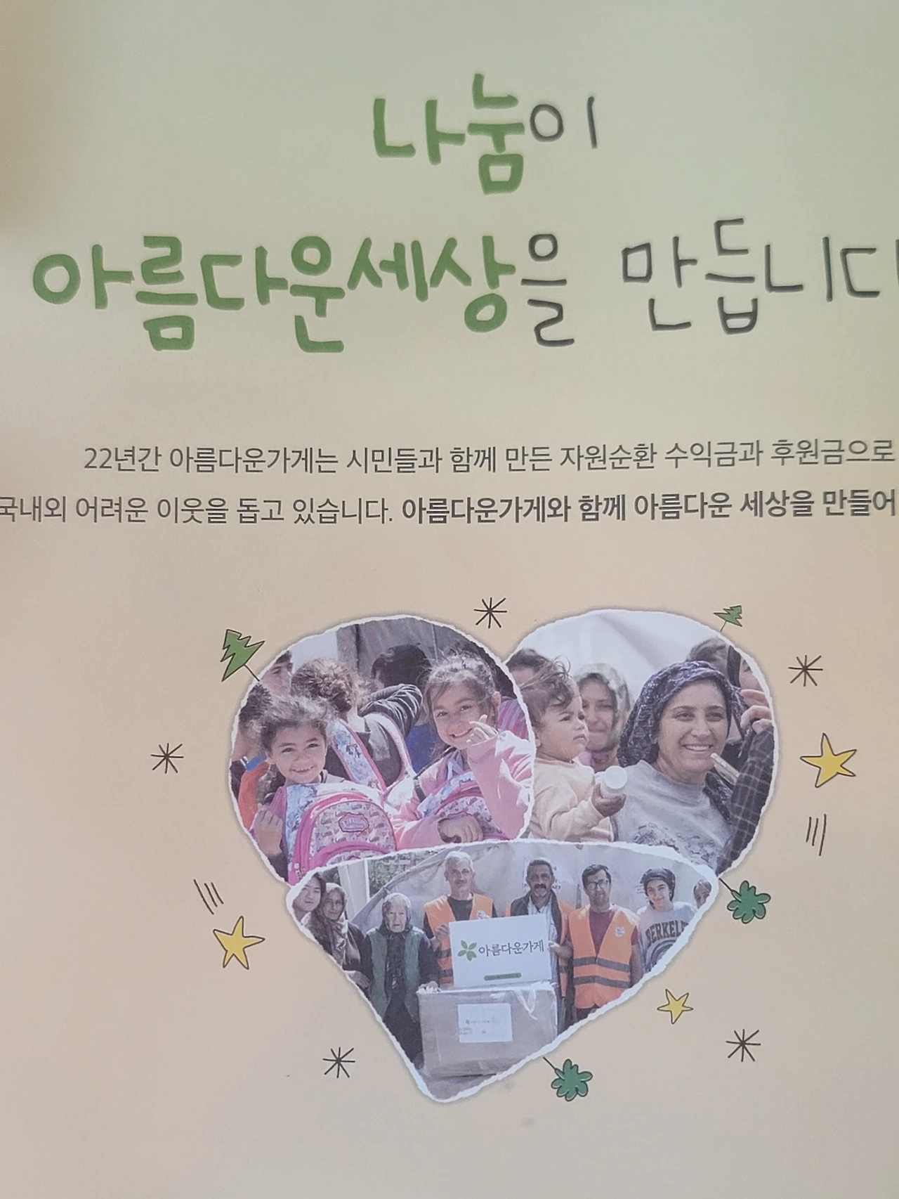 아름다운 가게는 기증받은 물품을 필요한 사람들에게 판매하는 가게로, 비교적 합리적인 가격에 물품들을 구매할 수 있습니다.