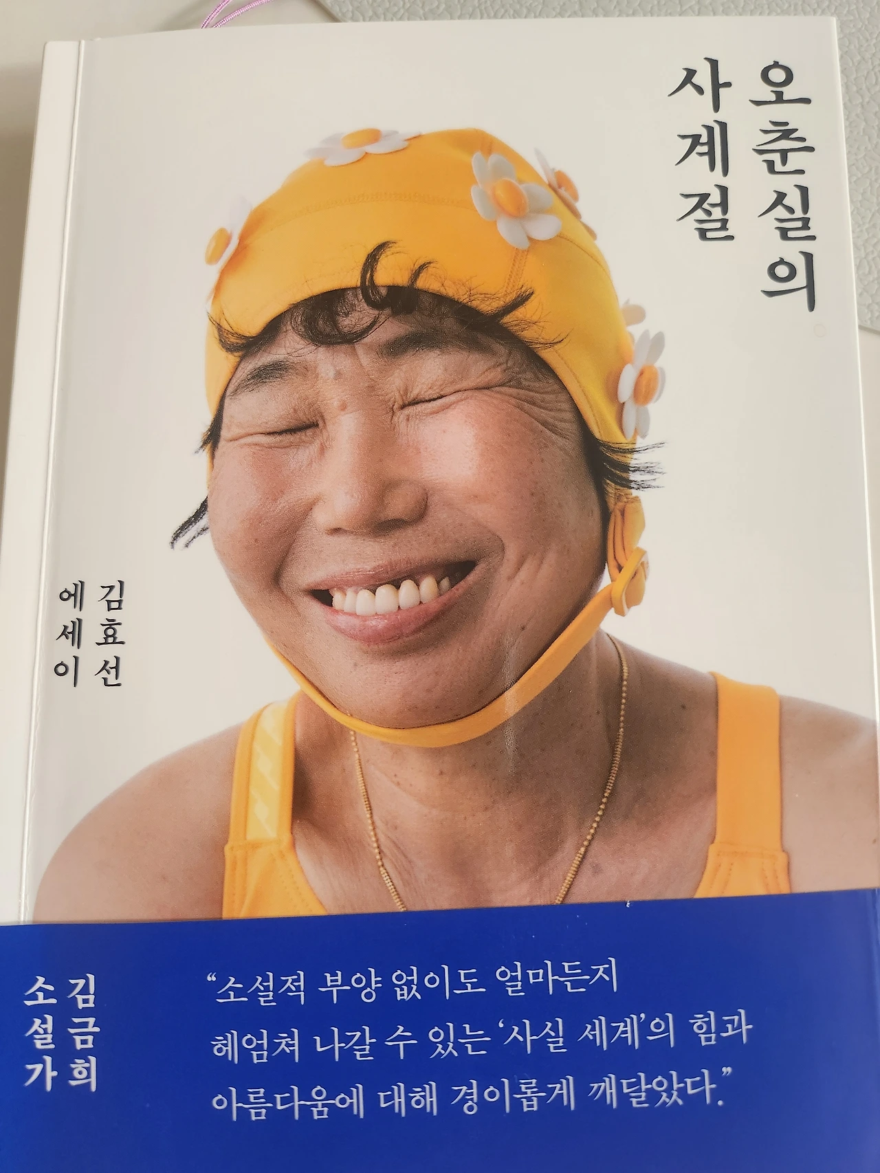 각각 노랑과 분홍으로 맞춘 수영모와 수영복을 착용한 모녀가 엄마는 앞표지에서 정면을 향해 눈을 감듯 활짝 웃고, 딸은 뒤표지에서 분홍뺨도 덩달아 꽃인 양 꿈을 좇는 눈동자와 함께 발그레하게 빛나고 있다. 그렇게 눈인사를 하고 그들의 이야기를 만났다.