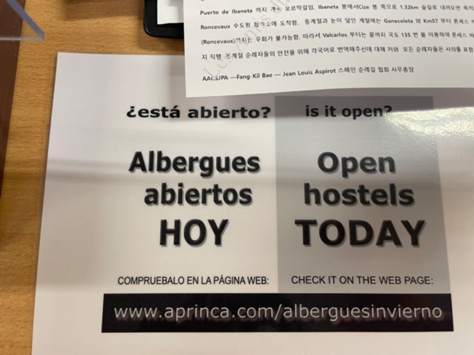 다행히도 봉사자분은 날 반갑게 맞아주셨다. 나에게 한국인이냐고 물으시곤 전체 루트가 나와있는 종이와 한국어로 번역된 종이를 건네어주시며 간단한 루트 설명과 순례자를 위한 숙소(이하 알베르게)의 종류와 겨울 까미노의 주의사항을 들었다.