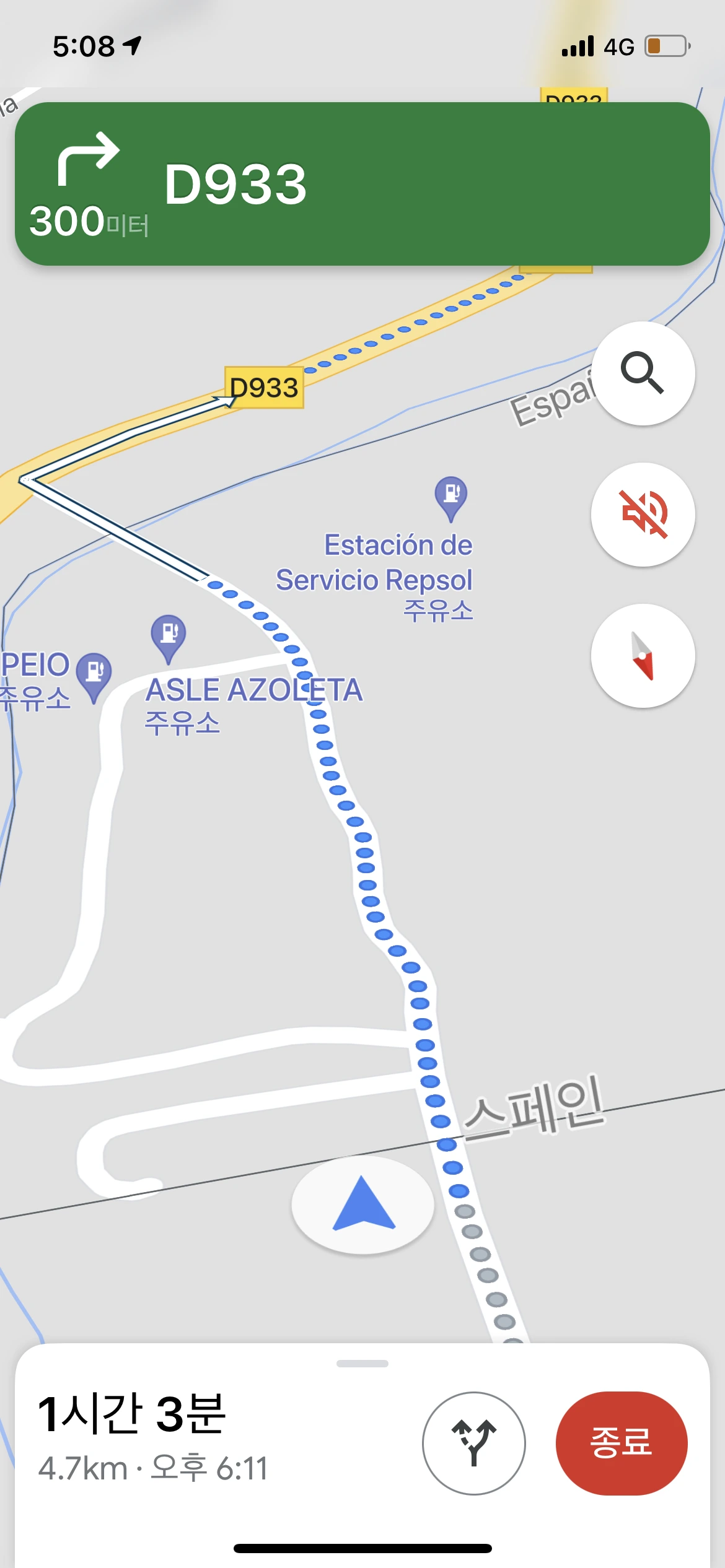 뭔가 이상하다. 분명 본격적인 출발 전, 생장의 시작점에서 Valcalos를 구글맵으로 찍었을 땐 걸어서 2-3시간이면 도착하는 건데!!!!!!! 봉사자 분도 3시간도 안 걸린다고 했는데!!!!!!!!!!!!!!! 나는!!!!! 왜!!!! 아직도 한참 남은 것인가!!!!!!!!!! 이미 걷기 시작한 지 2시간이 지났는데도 아직 4.7km나 더 가야 한다고 나온 것인가?