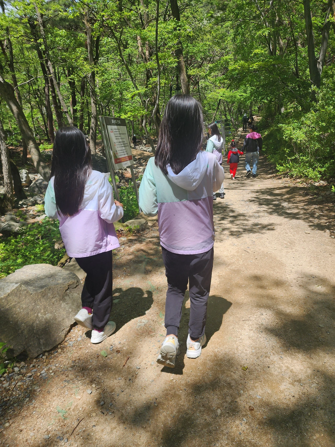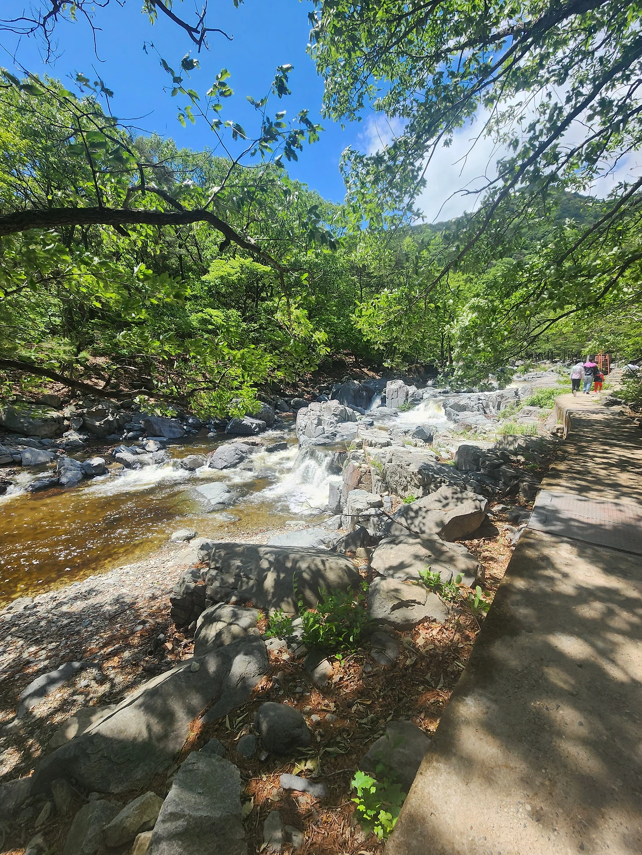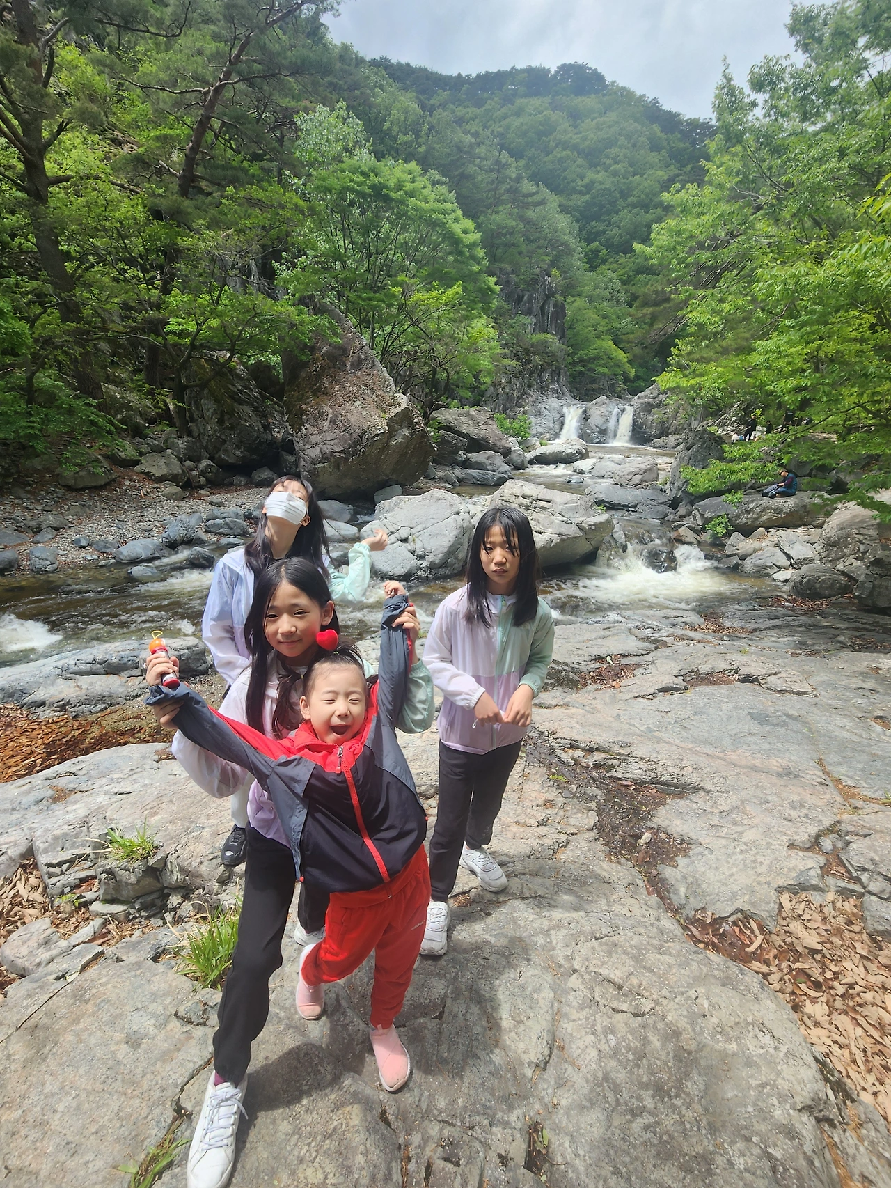 한참을 재잘거리는 소리에 중간쯤 걸으니 작은 폭포가 나왔다. 둘째가 힘들었는지, 눈물이 보인다.