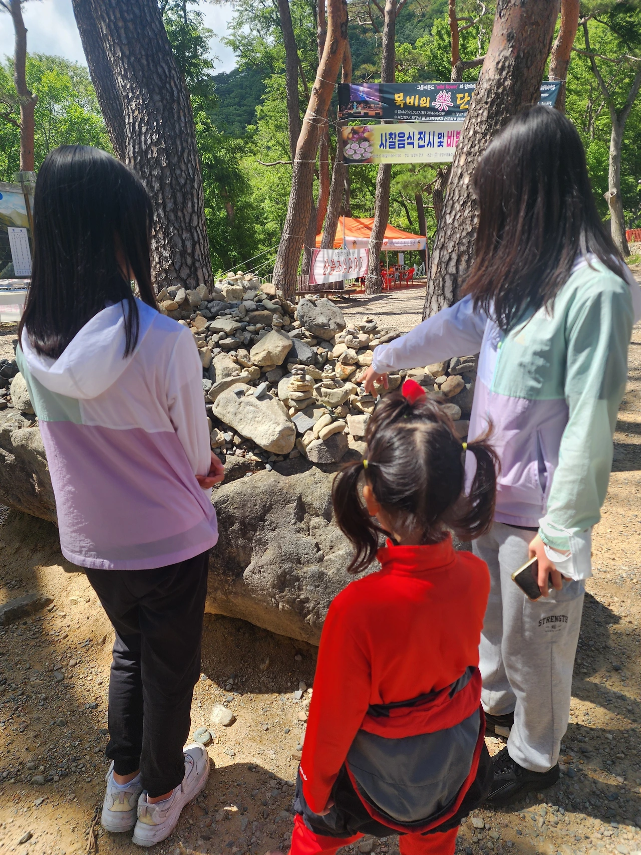 지수는 내려올 땐, 다리 아프다고 했었다. 그러나 언니들을 보자마자 뛰었다. 나무 아래에 돌탑을 쌓은 셋째, 또 다른 곳에 돌탑을 쌓은 첫째.