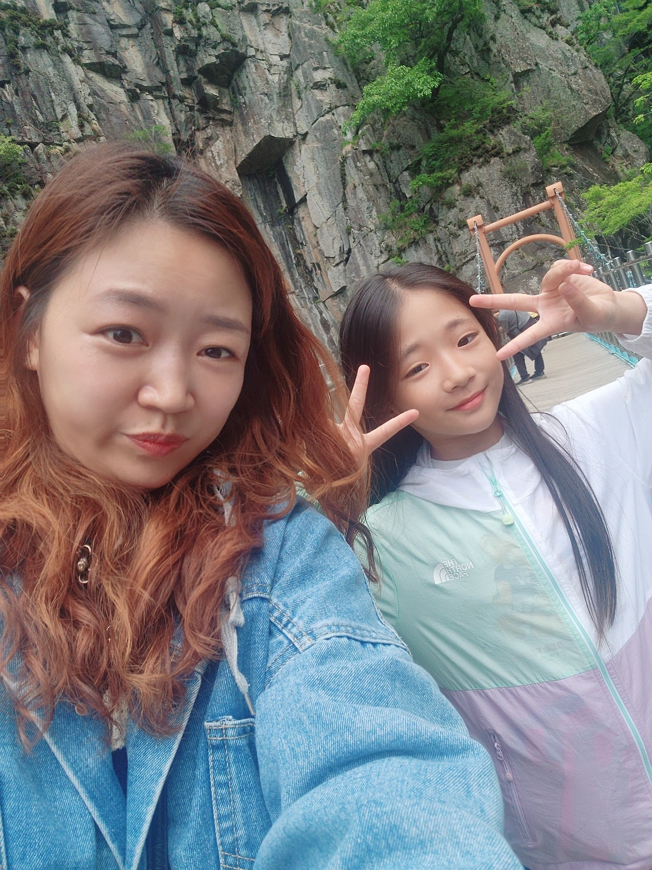 " 응 좋아. 엄마 저기 구름다리 위에 큰 폭포 있어."
