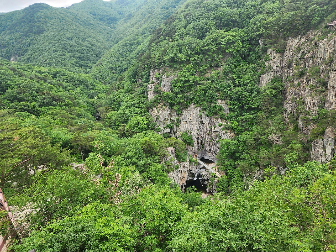 눈앞에 다시 펼쳐진 구름다리. 구름다리를 지나 보이는 연산폭포. 여전히 물줄기를 보니 속이 화악 트인다. 여유 있게 볼 수 있어 턱을 괴며 한참을 뚫어져라 보았다. 이걸 보고 나면 생각나서 몇 번을 더 올 것 같다. 관음폭포로 내려와 바위 위에 앉아 해골 같은 구멍을 눈 빠지듯 바라보았다. 저 안에는 뭐가 있을까? 궁금해지기도 한다. 위아래 전경을 훑어보며 감상하였다. 높게 보일 듯 말 듯 한 정자가 보였다. 저긴 어떻게 가지? 하며 옆쪽에 있는 계단이 보였다. 낯선 환경에 조금 낯설었다. 한걸음 한걸음 가니 정자를 갈 수 있는 계단이다. 호기심에 용기 내어 오르기 시작했다. 왠지 안 오르면 후회할 것 같은 느낌이었다. 한참 동안 수많은 계단을 돌고 돌아 오르니, 정자아래에 펼쳐진 풍경. 또 입이 다물어지지 않았다. 팔공산에서 오르는 산과 비교가 되지 않았다. 먼저 올라온 부부는 점심도시락을 펼쳐 먹고 있었다. 혹시 방해가 될까 사진을 찍어 담아두고 있었다. 그리고 멀리 보이는 산을 바라보고 있을 때, 부부가 오렌지를 먹어보라며 주었다. 미소를 지으며 입안으로 넣었다. 산새소리가 들려오는 정자에 앉아 먹으니, 오렌지맛도 오늘따라 달달하며 상큼하다.