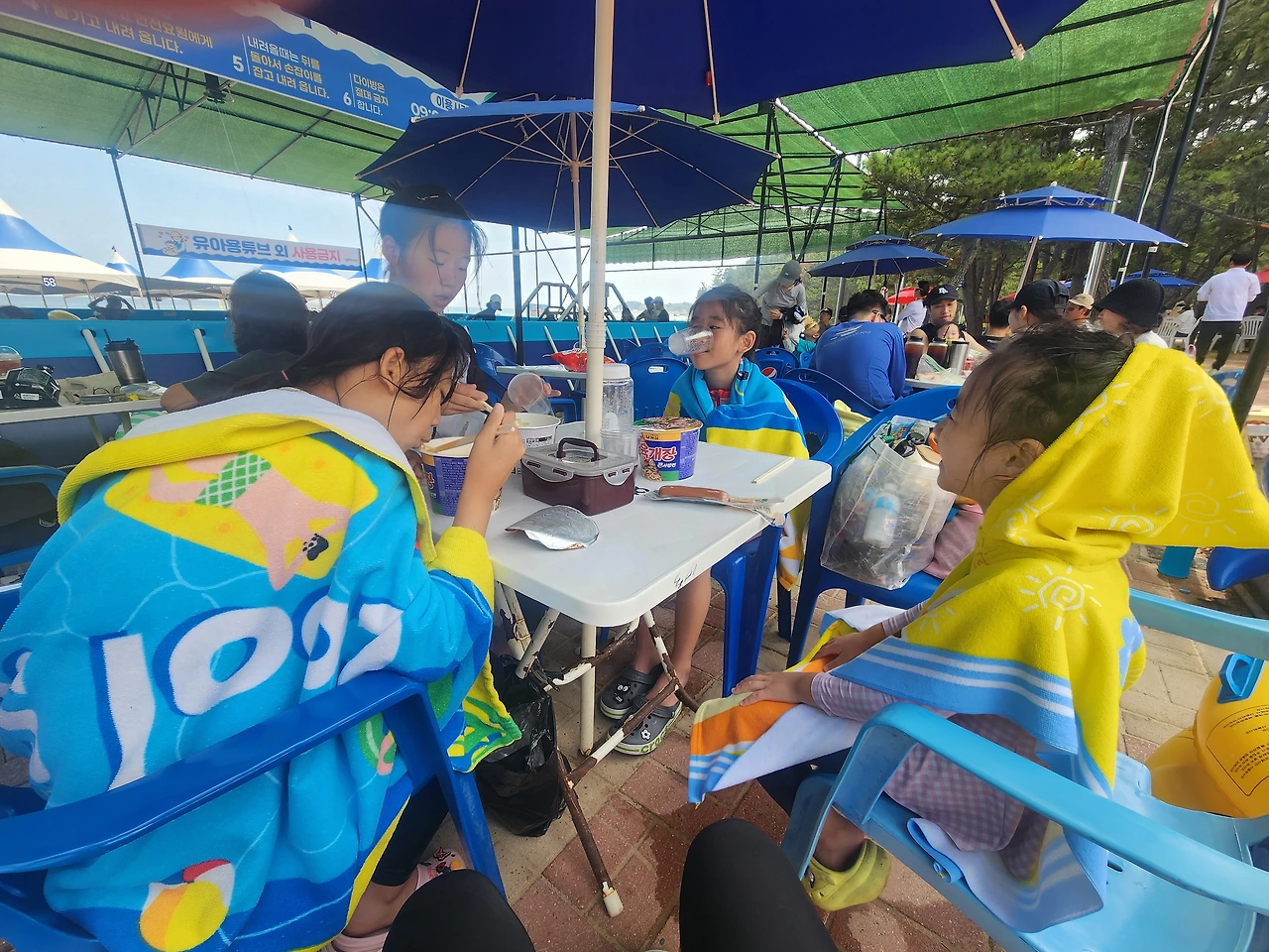 "얘들아, 배 안 고파? 컵라면, 핫바, 젤리, 과자 많으니 배고프면 먹고 물놀이해. "