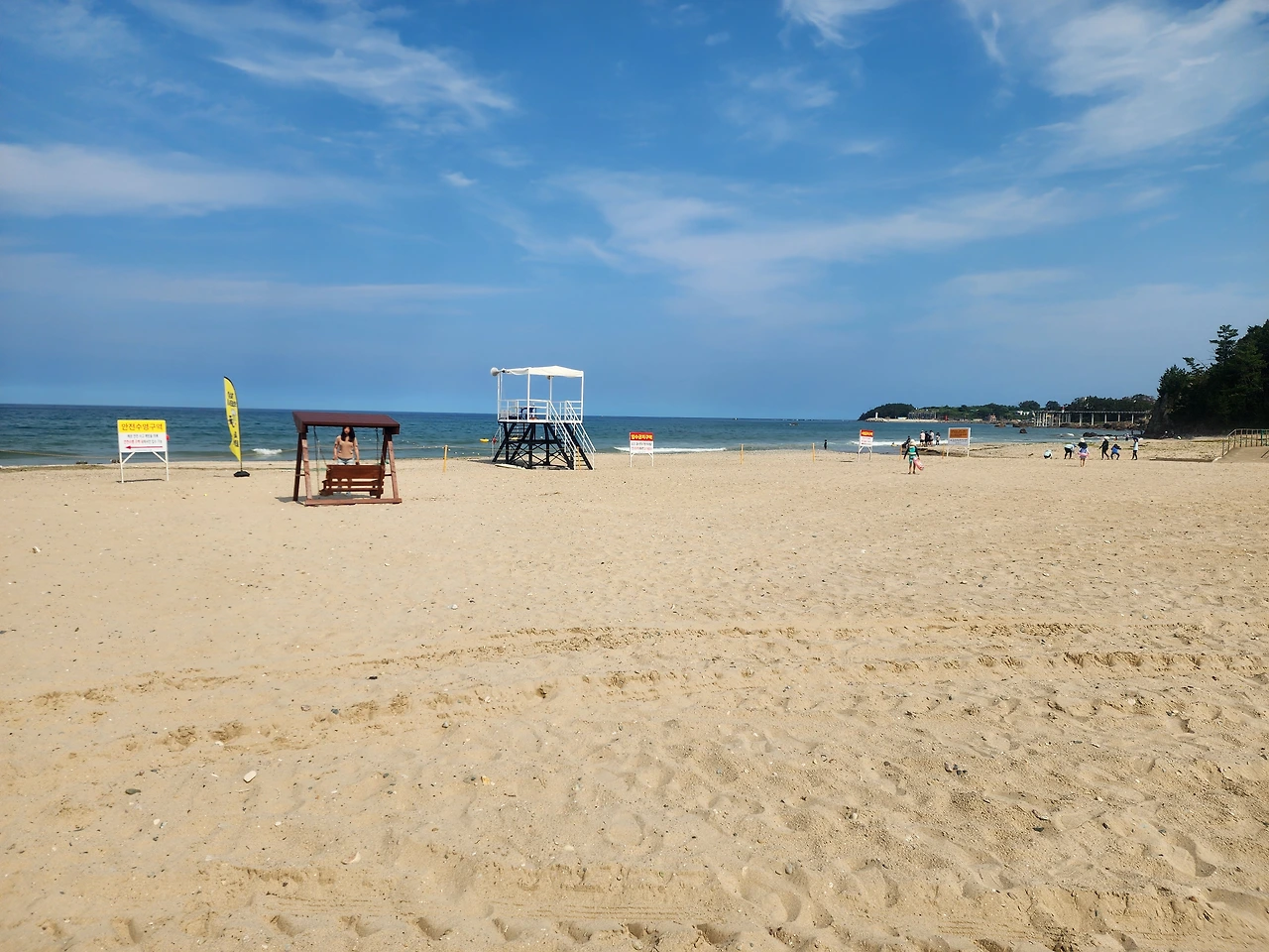 파도가 제법 쳐서 들어가진 못했지만 모래사장 위 한 장의 그림이 펼쳐졌다. 첫째가 어슬렁어슬렁.