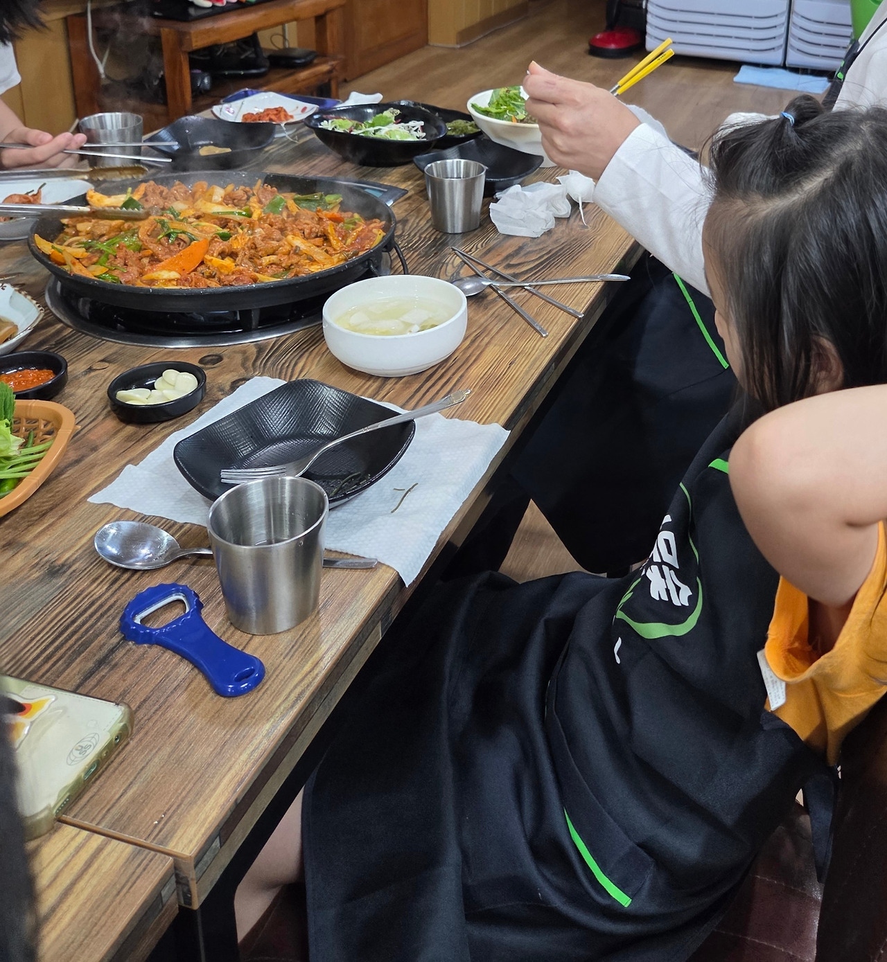 저녁시간이 되자, 우리 부부는 시누이부부와 함께 저녁을 먹으러 자리를 옮겼다. 도착 후, 아이들과 식당에 앉아 오리불고기가 익어가길 기다리고 있는데, 막내와 아이들은 재잘재잘 여전히 기운이 넘쳐난다. 막내는 지칠 법도 한데 언니들과 있으면 조그마한 몸에서 에너지가 솟구쳐 오른다. 배고파 허기진 배를 채우며 있는데 내 눈에 익숙한 모습이 포착되었다.