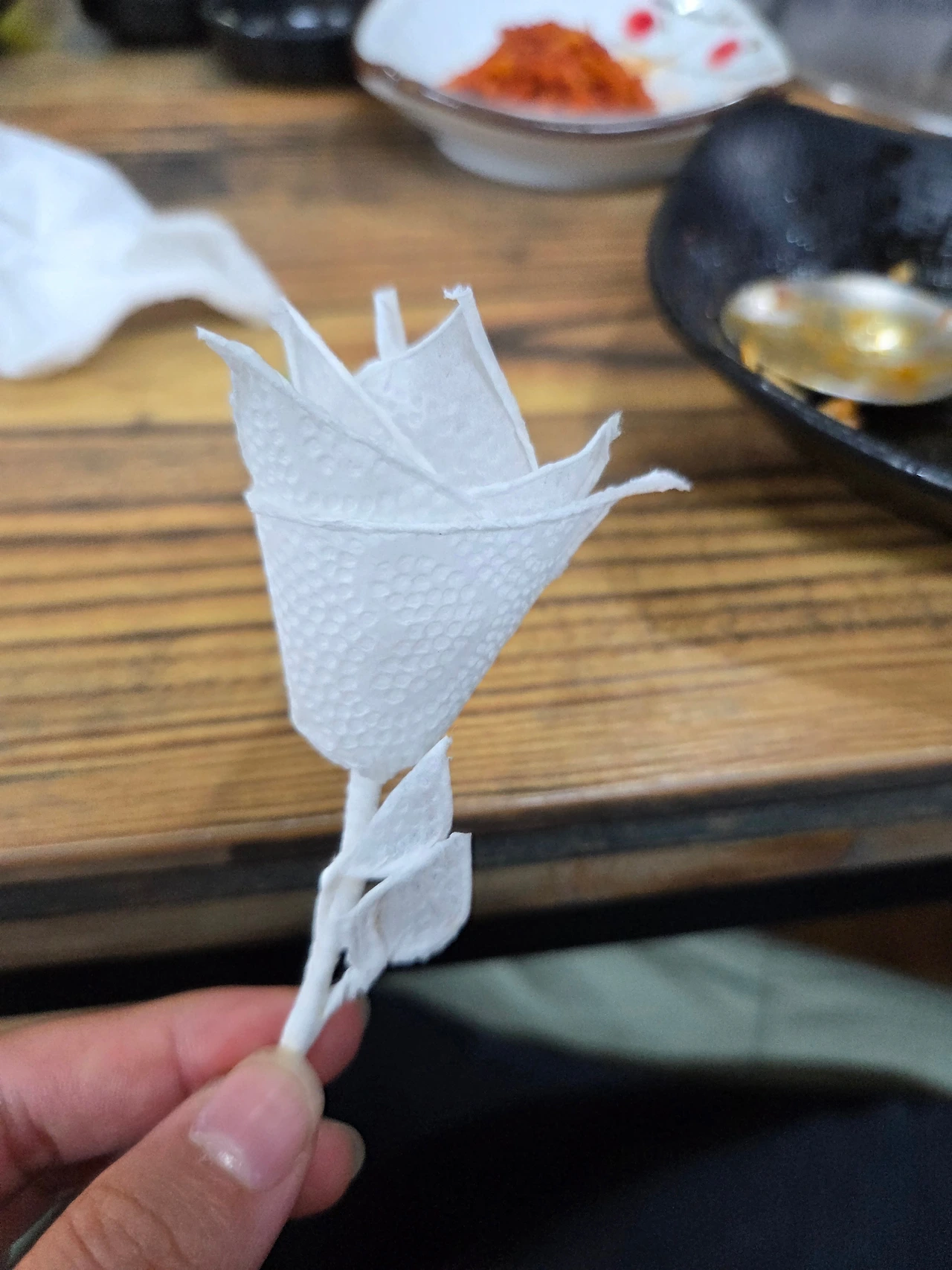 15년 전, 친구의 소개로 첫 만남이 있었던 카페에서 이야기를 나누며 시간을 보내는데 무언가 눈에 자꾸 집중이 되었다. 신랑손으로 만든 휴지장미. 한 장씩 한 장씩 손끝으로 야무지게 만든 장미 한 송이가 내 마음을 꽃아 버렸다. 그 시절 신랑의 모습은 아직도 심장이 심쿵 거린다. 결혼 후 가끔 식당을 들릴 때면 어느 순간 손끝으로 마법을 부리기 시작한다. 아이들도 이제는 아빠가 무엇을 하는지 눈치챈다. 막내는 여전히 신기한 듯 한참을 눈 빠지게 보고 있다.