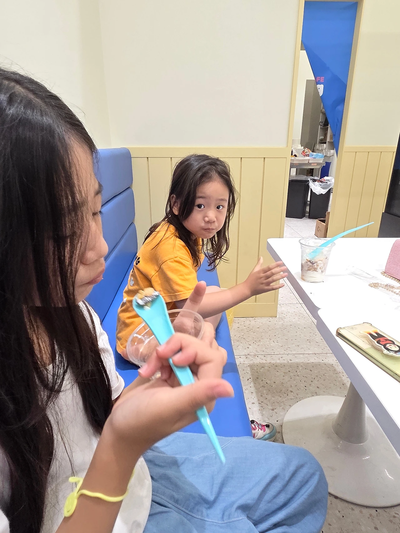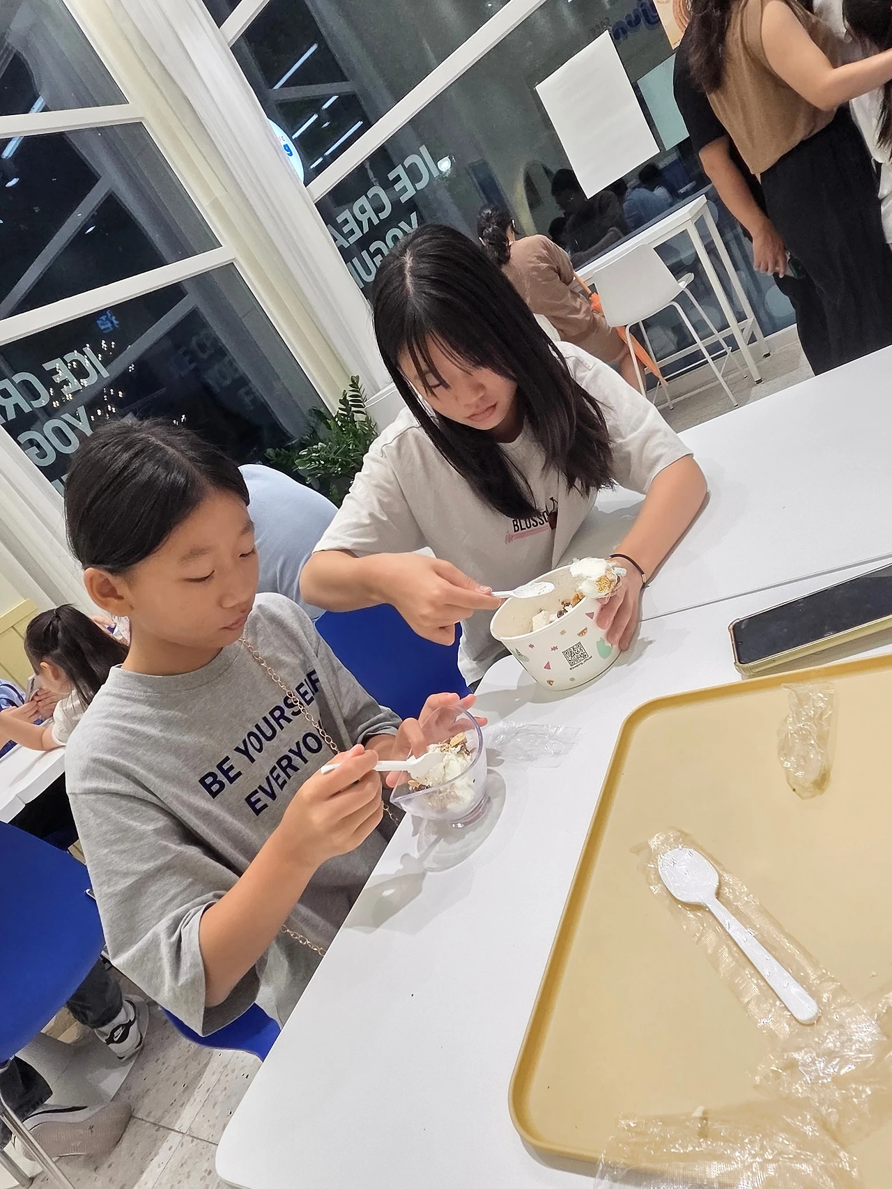 1호 2호가 한참을 추가추가해서 고르더니 폭풍흡입하는 아이들. 요즘은 음식하나에 추가하는 토핑이 얼마나 많은지...... 어딜 가나 토핑값이 후들후들. 4호는 언니들이 선택한 토핑이 마음에 들었는지 조그마한 입으로 녹여가며 잘도 먹는다. 우리 부부도 아이들 때문에 신세계의 맛을 보는구나.