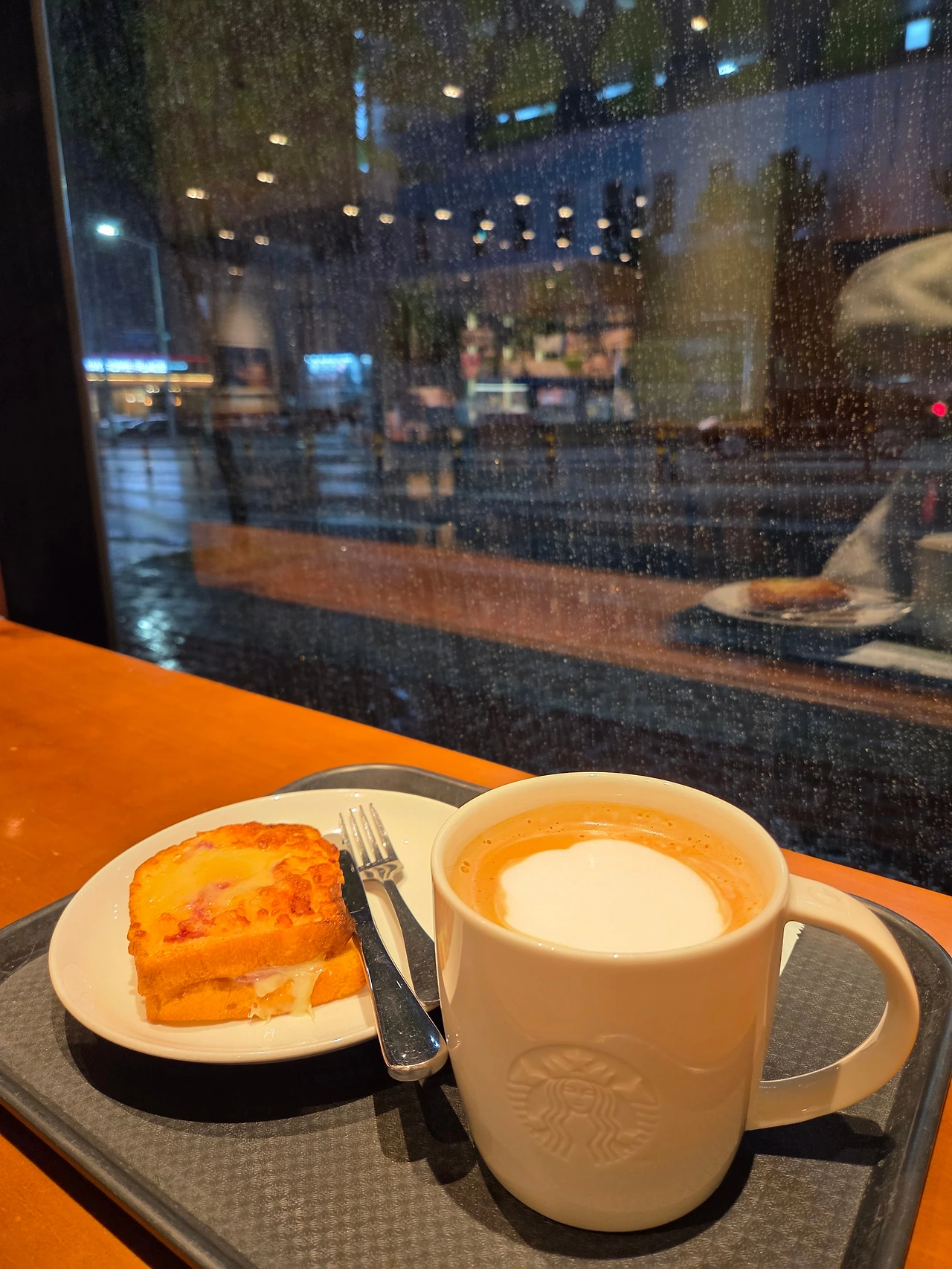 창가에 앉아 불빛사이로 보이는 빗줄기. 한참을 멍하니 앉아 내 귀 에어팟에서 들리는 음악을 들으며 생각에 빠져버렸다. 이게 자유부인의 낙원인가? 아이들이 보고 싶지만, 일주일에 한 번의 내 시간이 너무 행복하다. 달달한 토스트 한입, 모락모락 따뜻한 카페라떼. 오늘따라 비가 오는 창밖이 너무 아름다워 보인다.