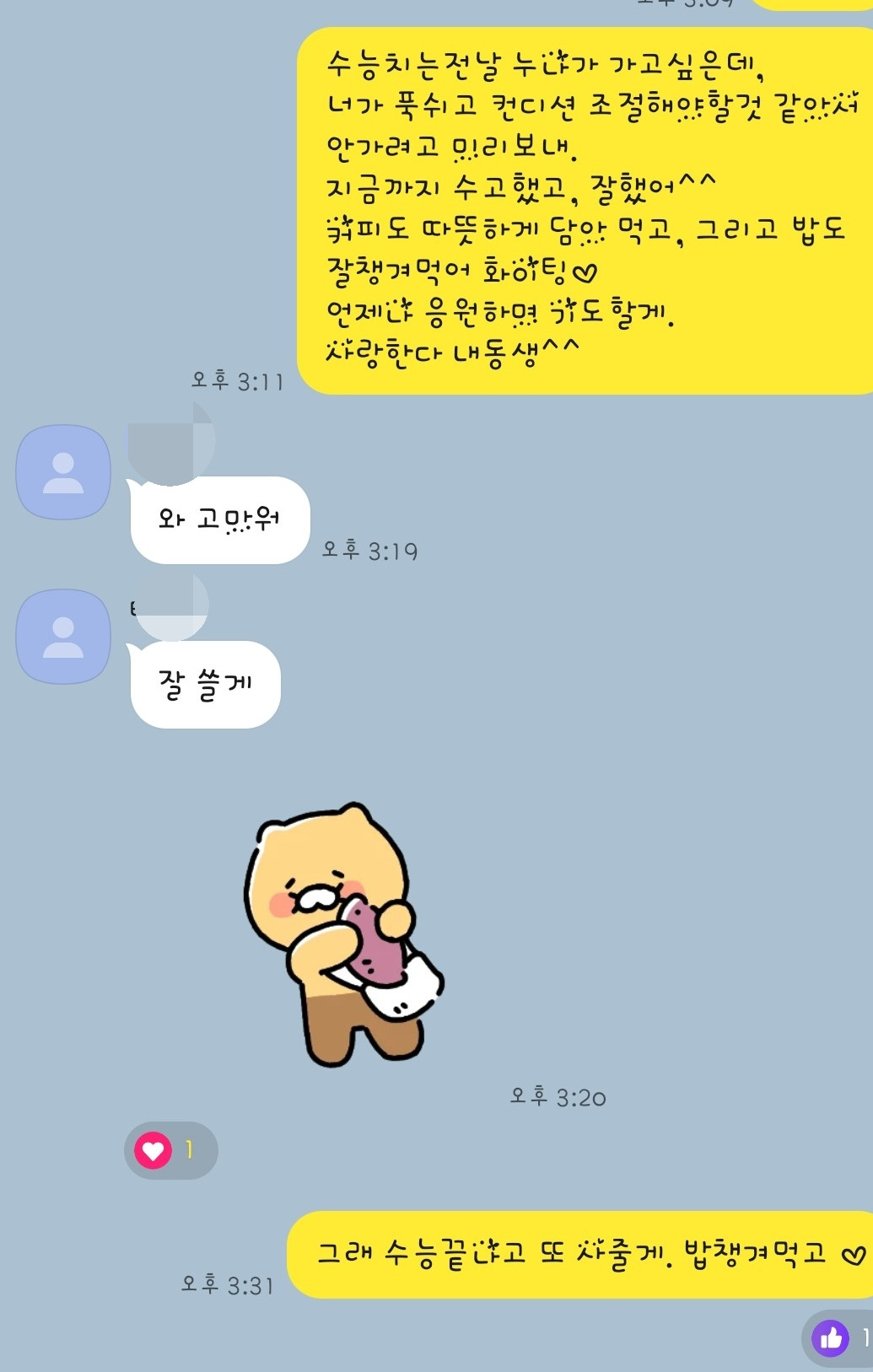 '네가 지금까지 잘해왔듯이 잘할 거라 믿어. 밤새 도서관 다니며 공부한다고 고생했어. 수능 끝나고 우리 남매끼리 밥 한 번하자. 큰누나가 쏜다!'