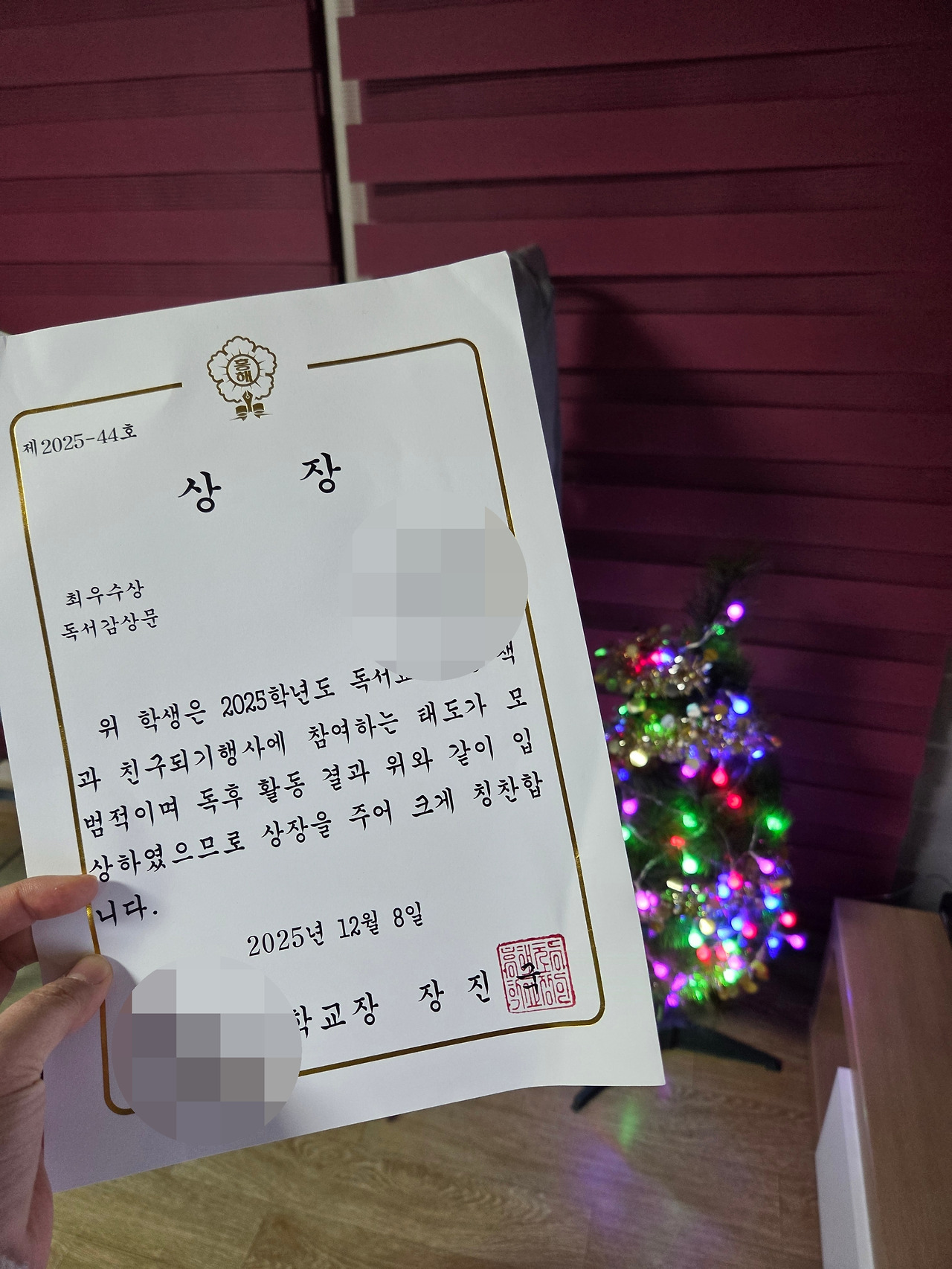 "우와. 대박. 책 많이 읽어서 저번에도 상 탔는데, 또 가져왔어? 파티해야겠네!. 여보 이거 봐."