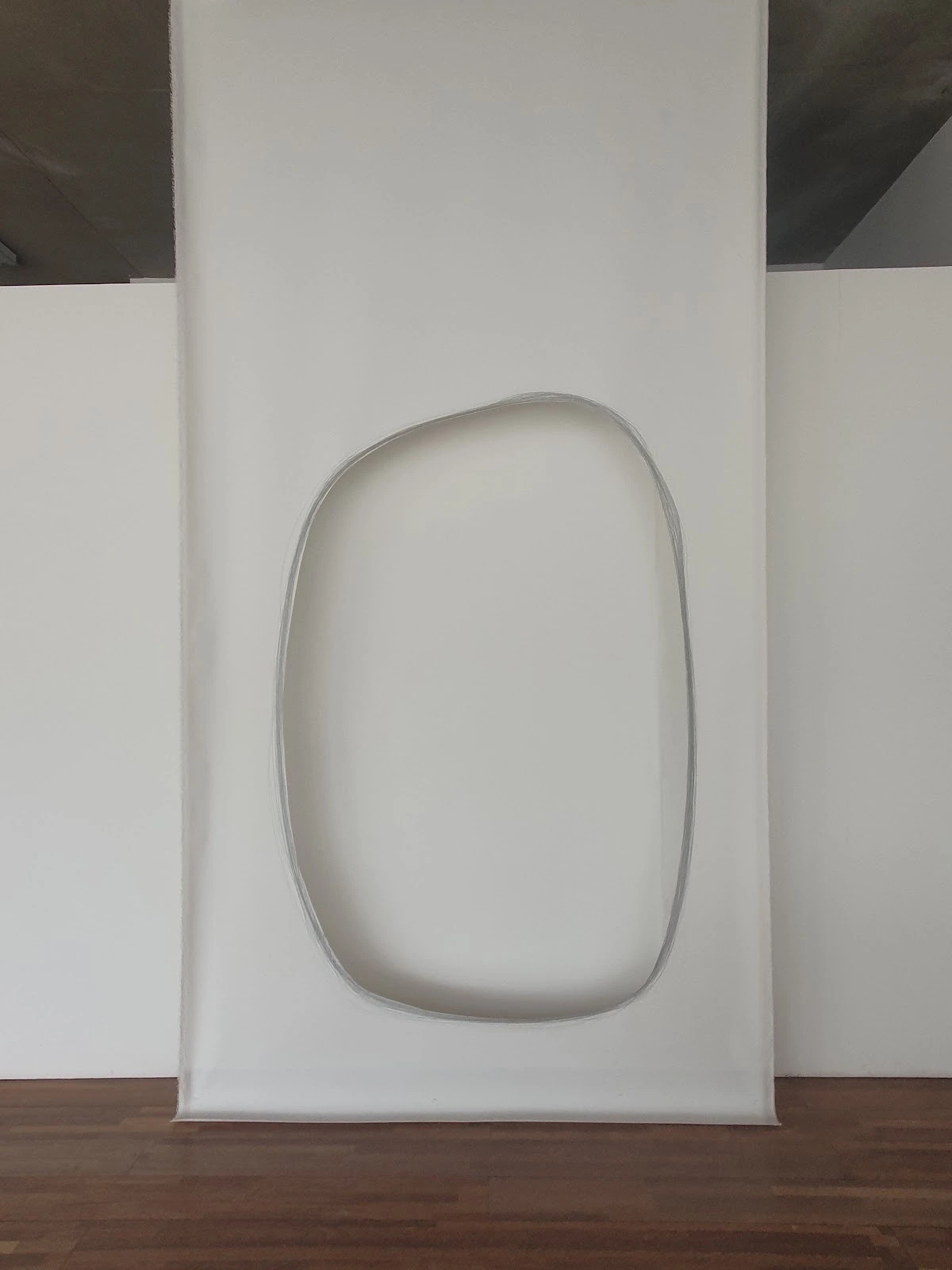 작품 왼편에는 흰 캔버스가 천장 위에서 아래로 펼쳐져 있고 중간에 큰 심연이 있습니다. 그리고 오른편 나무판에 작은 심연이 있습니다. 큰 심연은 우리가 바라보는 심연이고 작은 심연은 우리의 ‘바라 봄’입니다. 제가 앞서 이 연구가 보이는 것과 보이지 않는 것에 대한 연구라고 한 만큼 이 심연이 의미하는 바는 ‘볼 수 없는 것’을 말합니다. 여기서 제시하고자 하는 것은 우리의 바라볼 수 있는 가능성이 이 두 심연에 의해 지탱된다는 것 입니다.