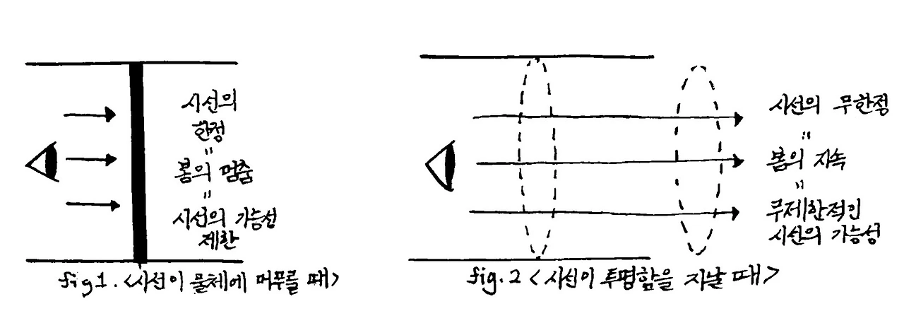 요컨대 우리의 시지각은 역설로 인해서 지탱됩니다. 1) ‘보이는 것’은 ‘보이지 않는 퍼스펙티브’가 보이는 것이 ‘머무를 수 있는 자리’를 제공해줌으로서 가능하게되고 2)‘보임’을 가능하게 하는 ‘퍼스펙티브’는 시선에 잡힐 듯하지만 결코 잡히지 않는 ‘도망치는 점-소실점’에 의해서 가능하게 되니 말입니다. 시지각에서 1)‘보이는 것’은 ‘보이지 않음’에 의해 ‘보이게’ 되고 2)‘가능성’은 ‘불가능성’에 의해 가능해집니다.