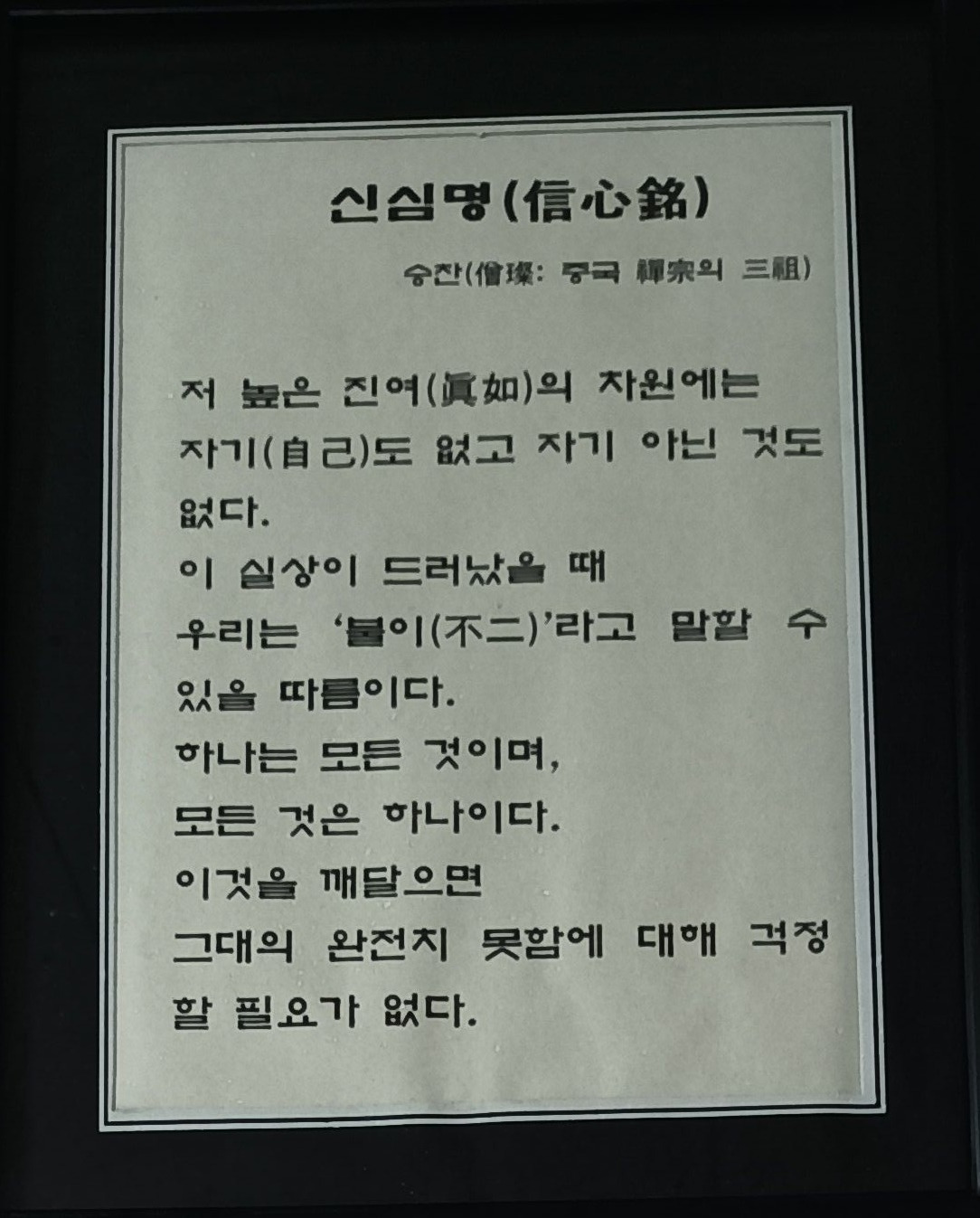 학창 시절 처음 접했던 신심명의 문구들이 요사이처럼 가슴에 와닿은 적은 없었던 것 같다. 인생의 잔여 배터리를 고작 30%가량 남겨둔 시점에서 문구 하나하나의 의미가 선연하게 다가온다. 우리네의 삶이 최종적으로 종결된 죽음의 상태를 이슬방울 같은 자아가 바닷속으로 합쳐진 상황으로 비유하고 있음이다. 내 몸을 구성하던 원자들이 흩어져서 자연으로 되돌아갔을 때 그 자연은 당연히 너와 나의 구분이 사라진 상황일 테니 말이다.