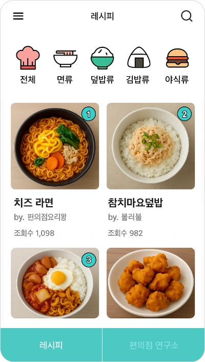 '편의점에서 뭐 먹지?'를 고민하는 사용자는 편의점 음식을 찾기 위해 서비스를 이용하는 순간 첫 화면에서 상품이 아닌 레시피가 노출되어 기대와 다른 경험을 하게 됩니다.