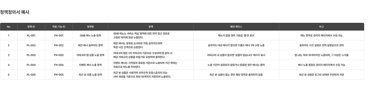 정책정의서는 기능 정의서에 정의한 기능에 대해 일정한 이용 제한을 두거나, 특정한 경우에만