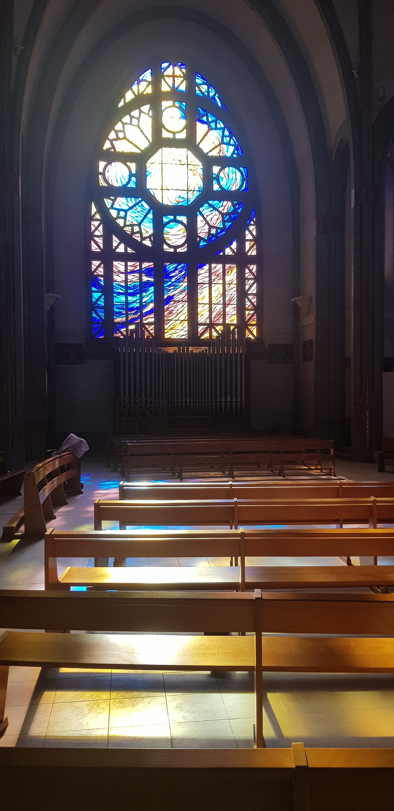 기숙사 방에 돌아온 나는 다시 방에서 나와 혼자 성당에 갔다. 성당에 앉아 파란 스테인드글라스를 바라보며, 하느님께 하루의 감사기도를 드렸다. 성당의 고요함 속에서 평안한 마음이 들었다.