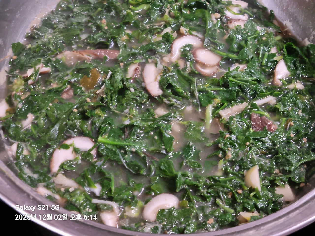 표고버섯과 멸치 가루, 마늘을 다져 넣어
