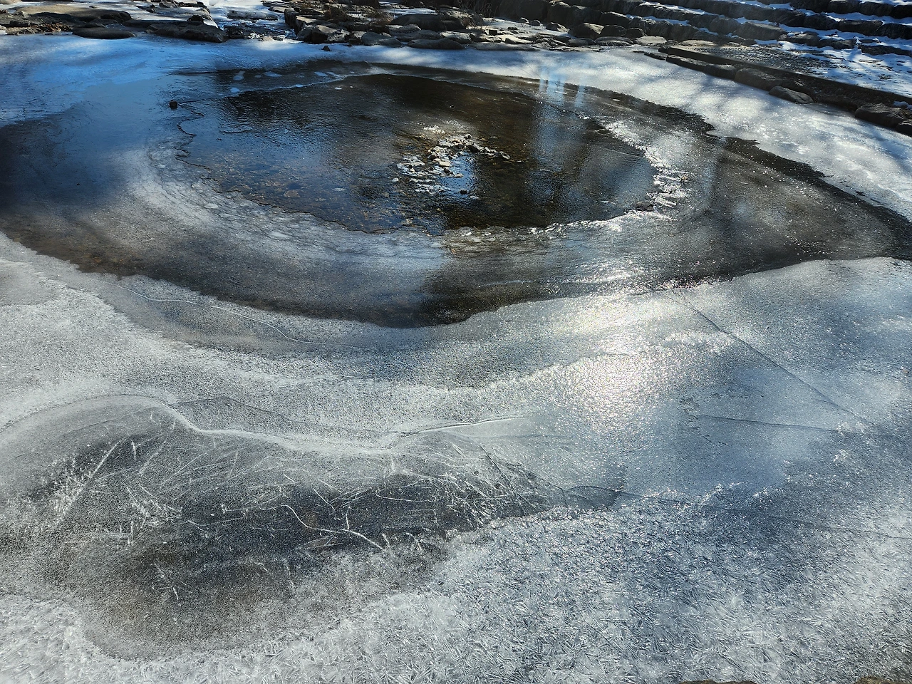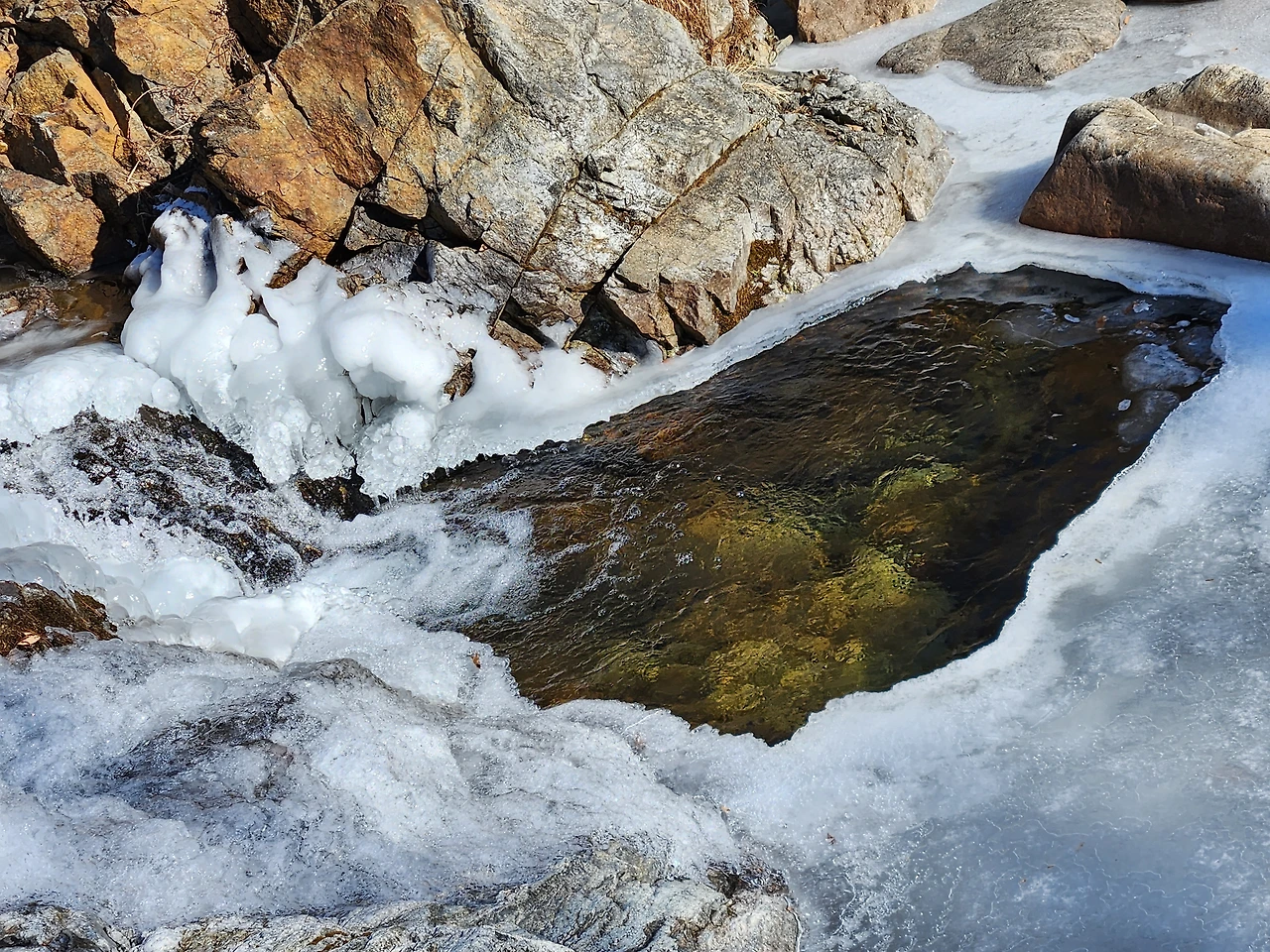 꽁꽁 얼은 얼음이 아닌 역동적으로 움직이는 물살을 뽐내고 있는 지점이 있었습니다.