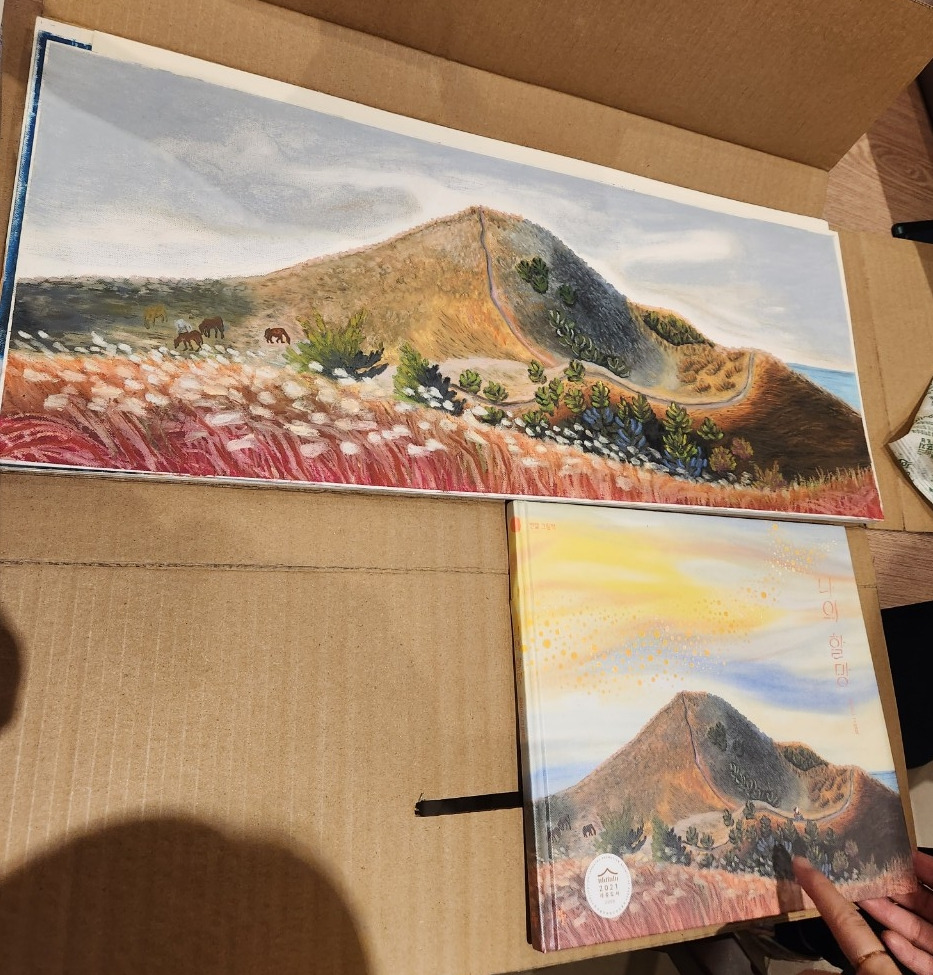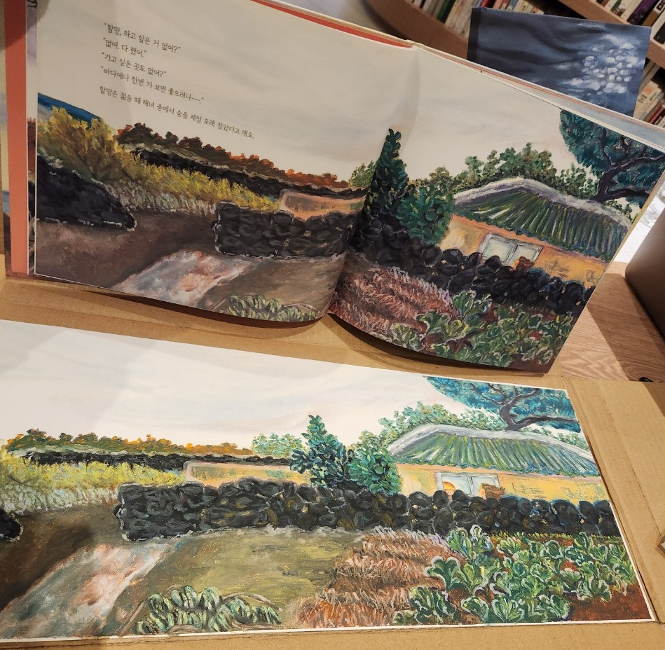 그림책뿐 아니라 원화도 보여 주셨는데. 황홀함 그 자체였다. 어떻게 하면 저렇게 그리는 거지? 작가님의 원화 작품을 보면서 오일파스텔이라는 그림도구에 관심이 생기기도 하였다. 제주하늘을 너무도 아름답게 표현한 첫표지 장면도 최고였다.