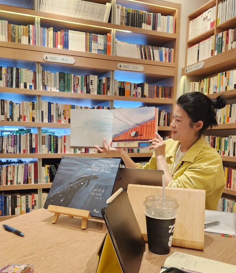 작가님의 두 번째 그림책은 ‘나의 첫 숨 너의 노래’이다. 이 그림책은 우리 그림책 만들기 과정 동안에 좋은 뉴스를 가져다준 책이었다. 프로그램 중반 정도에, 2023년 올해의 소년한국 문학 부분 우수어린이도서로 선정되었다는 기쁜 소식을 들었다. 개인특별상도 수상한 ' 나의 첫숨, 너의 노래'( 글: 강그늘 그림:정은진/나무말미)